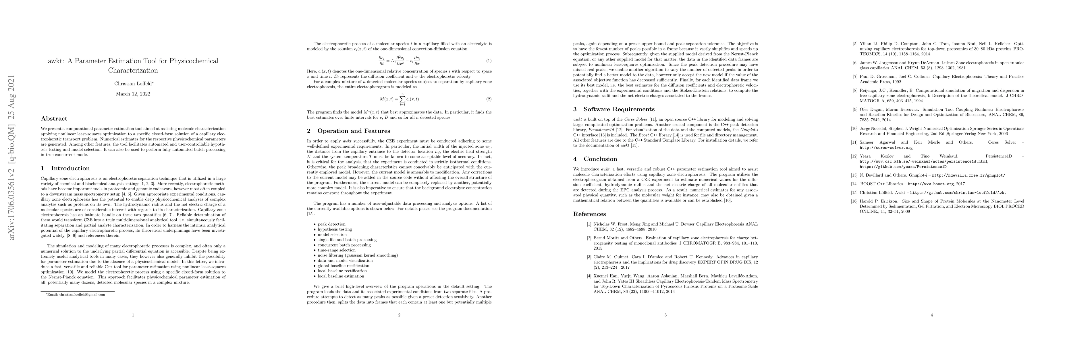 The research introduces a computational parameter estimation tool called 'Awkt' that uses nonlinear least-squares optimization on a specific closed-form solution of a capillary electrophoretic transport problem to estimate physicochemical parameters for molecule characterization in capillary zone electrophoresis (CZE).