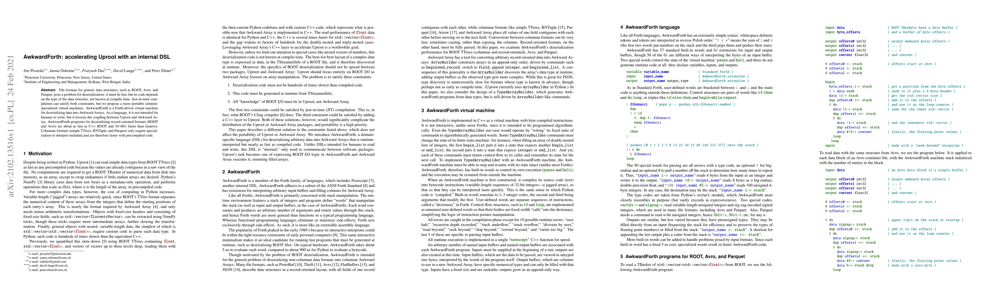 File formats for generic data structures, such as ROOT, Avro, and Parquet, pose a problem for deserialization: it must be fast, but its code depends on the type of the data structure, not known at compile-time. Just-in-time compilation can satisfy both constraints, but we propose a more portable solution: specialized virtual machines. AwkwardForth is a Forth-driven virtual machine for deserializing data into Awkward Arrays. As a language, it is not intended for humans to write, but it loosens the coupling between Uproot and Awkward Array. AwkwardForth programs for deserializing record-oriented formats (ROOT and Avro) are about as fast as C++ ROOT and 10-80$\times$ faster than fastavro. Columnar formats (simple TTrees, RNTuple, and Parquet) only require specialization to interpret metadata and are therefore faster with precompiled code.