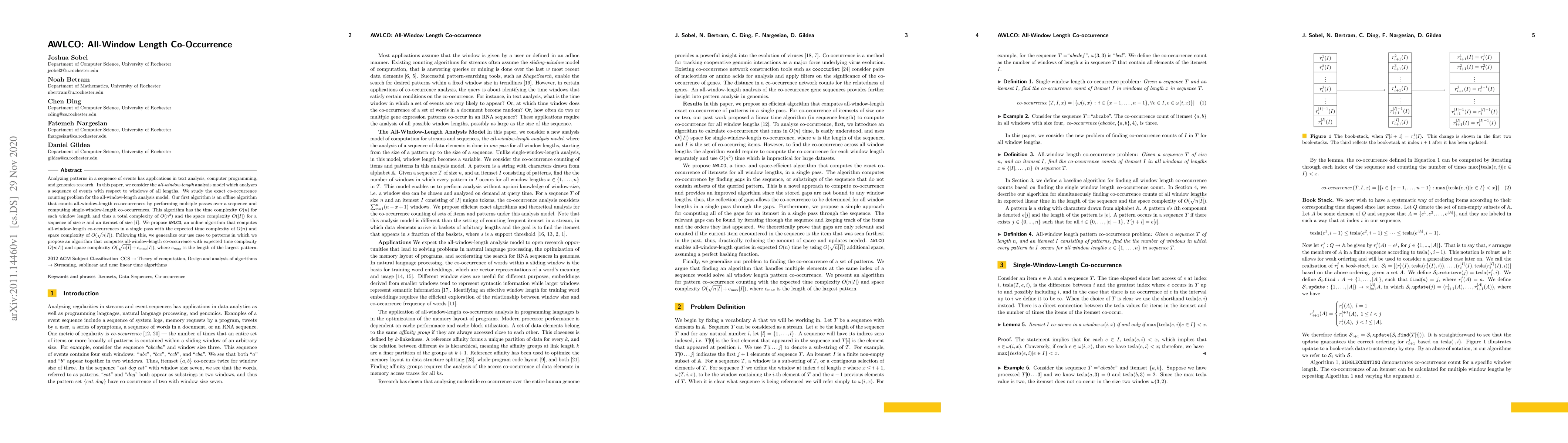 Analyzing patterns in a sequence of events has applications in text analysis, computer programming, and genomics research. In this paper, we consider the all-window-length analysis model which analyzes a sequence of events with respect to windows of all lengths. We study the exact co-occurrence counting problem for the all-window-length analysis model. Our first algorithm is an offline algorithm that counts all-window-length co-occurrences by performing multiple passes over a sequence and computing single-window-length co-occurrences. This algorithm has the time complexity $O(n)$ for each window length and thus a total complexity of $O(n^2)$ and the space complexity $O(|I|)$ for a sequence of size n and an itemset of size $|I|$. We propose AWLCO, an online algorithm that computes all-window-length co-occurrences in a single pass with the expected time complexity of $O(n)$ and space complexity of $O( \sqrt{ n|I| })$. Following this, we generalize our use case to patterns in which we propose an algorithm that computes all-window-length co-occurrence with expected time complexity $O(n|I|)$ and space complexity $O( \sqrt{n|I|} + e_{max}|I|)$, where $e_{max}$ is the length of the largest pattern.