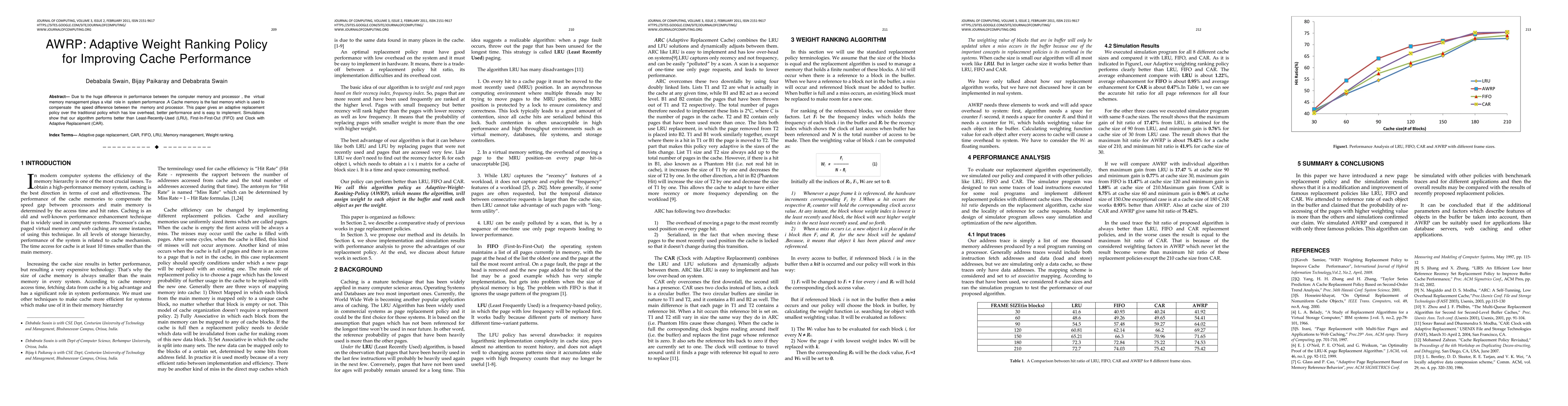 This paper proposes an adaptive weight ranking policy (AWRP) to enhance cache performance by addressing the speed disparity between memory and processors. The proposed method outperforms traditional replacement policies like LRU, FIFO, and CAR in simulations.