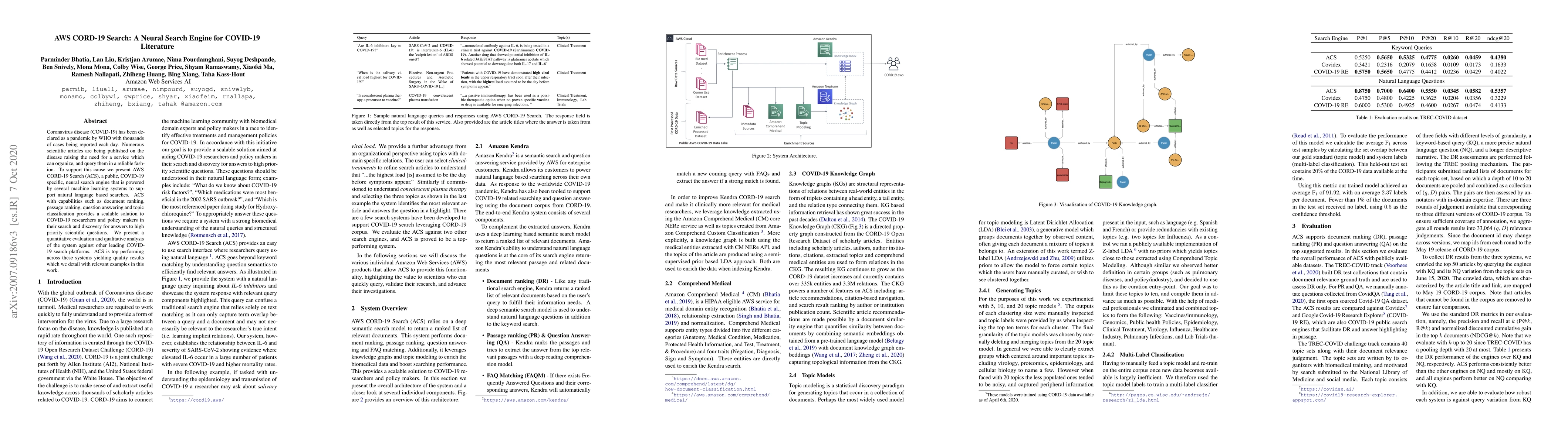 AWS CORD-19 Search (ACS) is a neural search engine designed to organize and query COVID-19 literature efficiently. It offers advanced features like document ranking, passage ranking, question answering, and topic classification, outperforming other leading COVID-19 search platforms in both quantitative and qualitative evaluations.