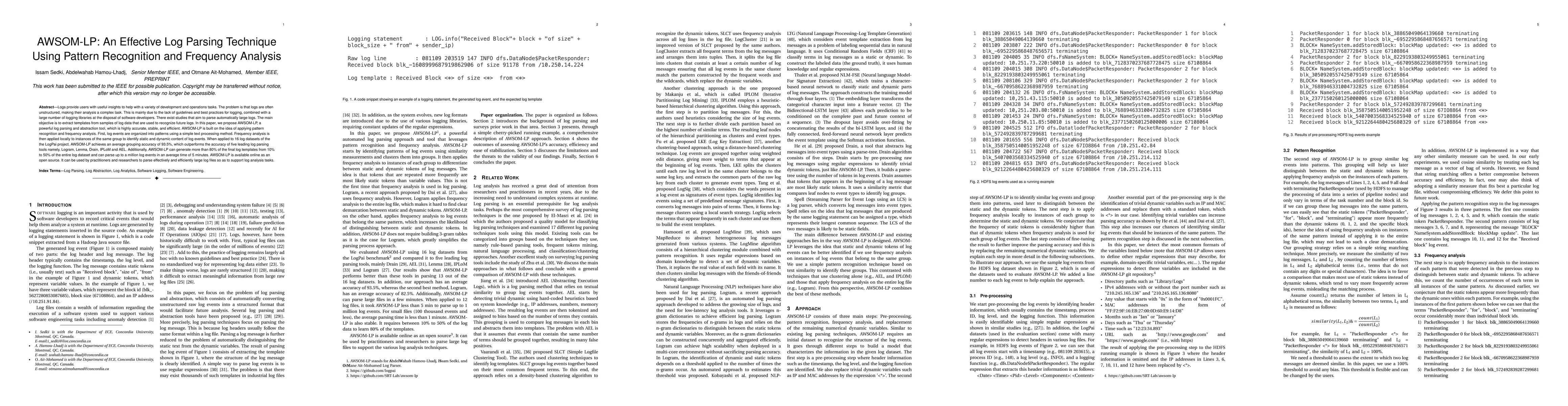 AWSOM-LP is a novel log parsing technique that leverages pattern recognition and frequency analysis to accurately parse and abstract large, unstructured log files. It achieves an average grouping accuracy of 93.5% and outperforms existing tools, making it a powerful tool for log analysis.