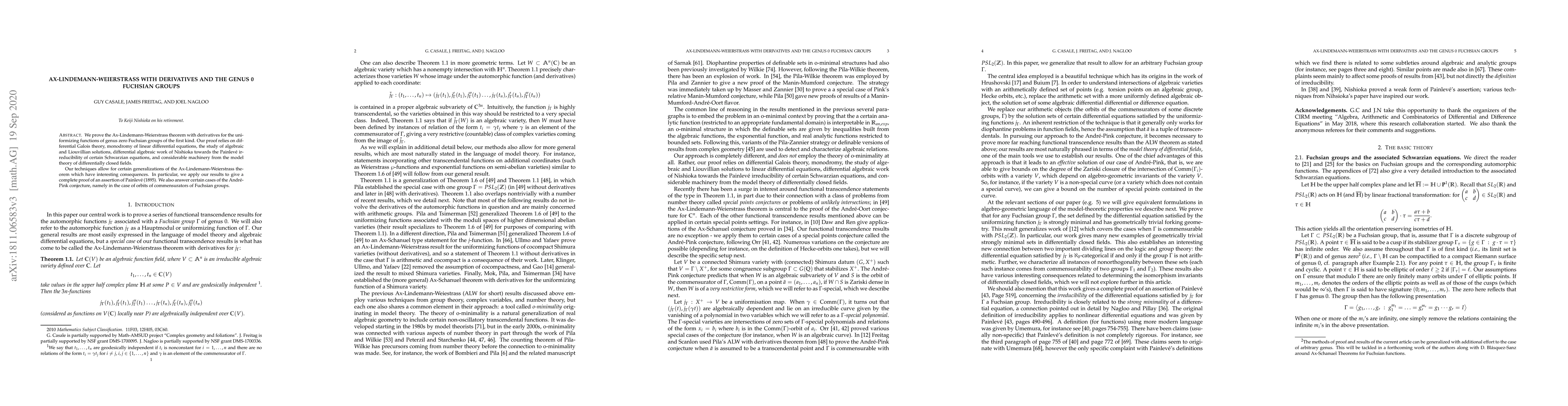 We prove the Ax-Lindemann-Weierstrass theorem with derivatives for the uniformizing functions of genus zero Fuchsian groups of the first kind. Our proof relies on differential Galois theory, monodromy of linear differential equations, the study of algebraic and Liouvillian solutions, differential algebraic work of Nishioka towards the Painlev\'e irreducibility of certain Schwarzian equations, and considerable machinery from the model theory of differentially closed fields. Our techniques allow for certain generalizations of the Ax-Lindemann-Weierstrass theorem which have interesting consequences. In particular, we apply our results to answer a question of Painlev\'e (1895). We also answer certain cases of the Andr\'e-Pink conjecture, namely in the case of orbits of commensurators of Fuchsian groups.