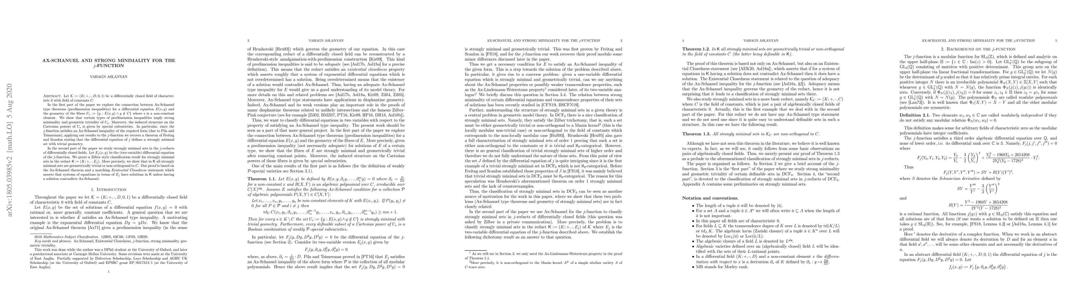 Let $\mathcal{K}:=(K;+,\cdot, D, 0, 1)$ be a differentially closed field of characteristic $0$ with field of constants $C$. In the first part of the paper we explore the connection between Ax-Schanuel type theorems (predimension inequalities) for a differential equation $E(x,y)$ and the geometry of the fibres $U_s:=\{ y:E(s,y) \wedge y \notin C \}$ where $s$ is a non-constant element. We show that certain types of predimension inequalities imply strong minimality and geometric triviality of $U_s$. Moreover, the induced structure on the Cartesian powers of $U_s$ is given by special subvarieties. In particular, since the $j$-function satisfies an Ax-Schanuel inequality of the required form (due to Pila and Tsimerman), applying our results to the $j$-function we recover a theorem of Freitag and Scanlon stating that the differential equation of $j$ defines a strongly minimal set with trivial geometry. In the second part of the paper we study strongly minimal sets in the $j$-reducts of differentially closed fields. Let $E_j(x,y)$ be the (two-variable) differential equation of the $j$-function. We prove a Zilber style classification result for strongly minimal sets in the reduct $\mathsf{K}:=(K;+, \cdot, E_j)$. More precisely, we show that in $\mathsf{K}$ all strongly minimal sets are geometrically trivial or non-orthogonal to $C$. Our proof is based on the Ax-Schanuel theorem and a matching Existential Closedness statement which asserts that systems of equations in terms of $E_j$ have solutions in $\mathsf{K}$ unless having a solution contradicts Ax-Schanuel.