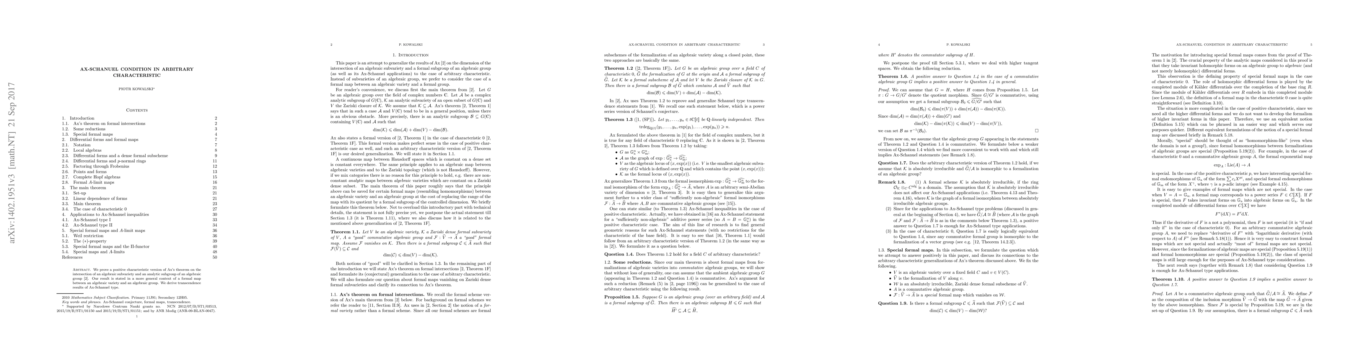 Summary: This paper proves a positive characteristic version of Ax's theorem concerning the intersection of algebraic subvarieties and analytic subgroups, extending the result to formal maps between algebraic varieties and groups, and derives Ax-Schanuel type transcendence results.
