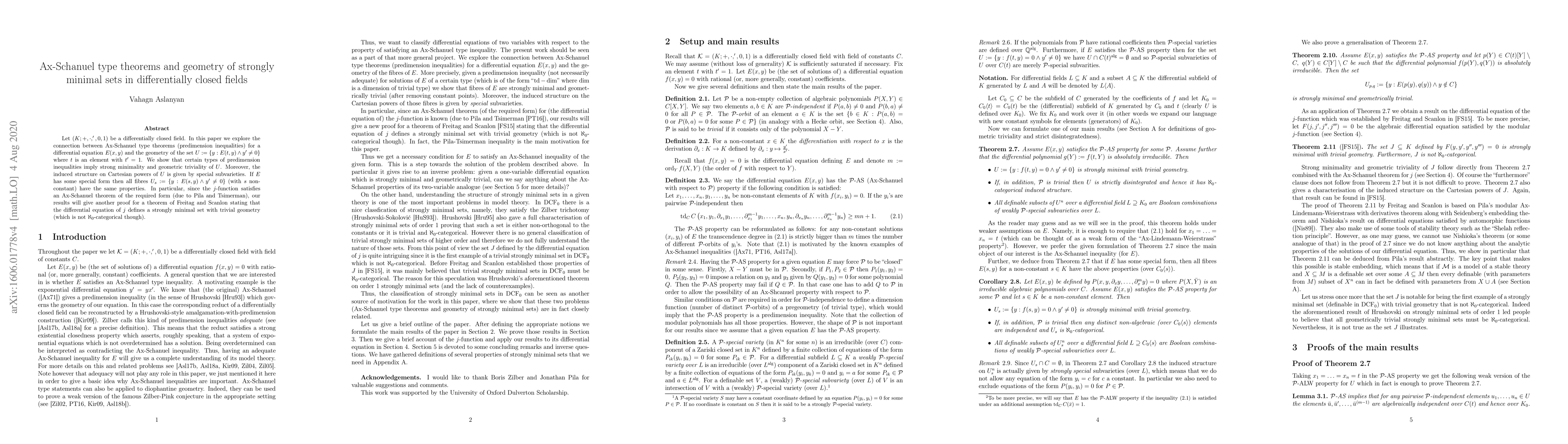 Let $(K;+,\cdot, ', 0, 1)$ be a differentially closed field. In this paper we explore the connection between Ax-Schanuel type theorems (predimension inequalities) for a differential equation $E(x,y)$ and the geometry of the set $U:=\{ y:E(t,y) \wedge y' \neq 0 \}$ where $t$ is an element with $t'=1$. We show that certain types of predimension inequalities imply strong minimality and geometric triviality of $U$. Moreover, the induced structure on Cartesian powers of $U$ is given by special subvarieties. If $E$ has some special form then all fibres $U_s:=\{ y:E(s,y) \wedge y' \neq 0 \}$ (with $s$ non-constant) have the same properties. In particular, since the $j$-function satisfies an Ax-Schanuel theorem of the required form (due to Pila and Tsimerman), our results will give another proof for a theorem of Freitag and Scanlon stating that the differential equation of $j$ defines a strongly minimal set with trivial geometry (which is not $\aleph_0$-categorical though).