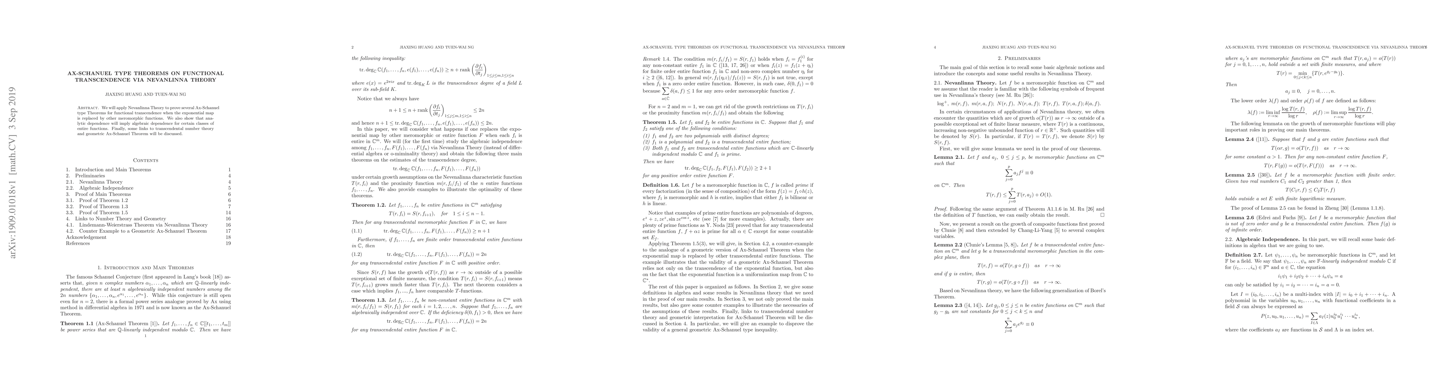 This paper applies Nevanlinna Theory to establish Ax-Schanuel type theorems for functional transcendence with meromorphic functions replacing the exponential map. It demonstrates that analytic dependence implies algebraic dependence for specific entire functions and explores connections to transcendental number theory and geometric Ax-Schanuel theorems.