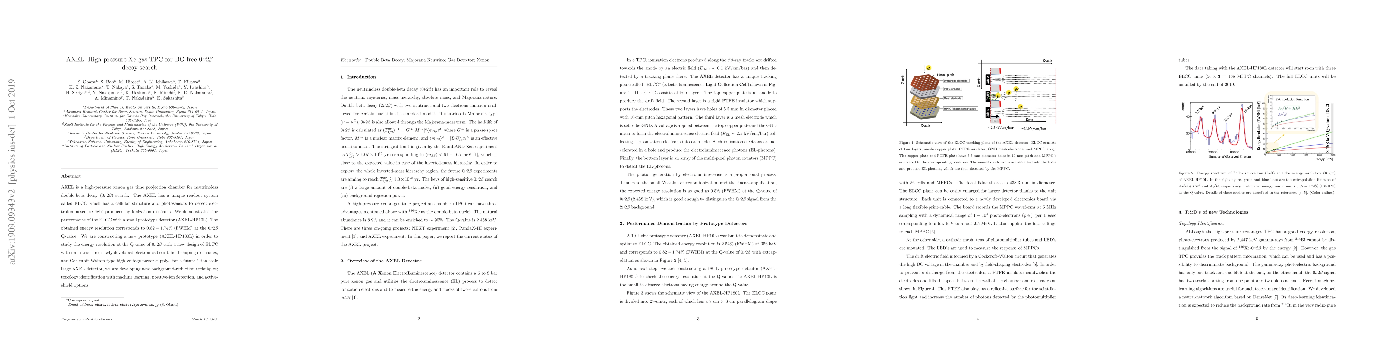 AXEL is a high-pressure xenon gas time projection chamber for neutrinoless double-beta decay (0n2b) search. The AXEL has a unique readout system called ELCC which has a cellular structure and photosensors to detect electroluminescence light produced by ionization electrons. We demonstrated the performance of the ELCC with a small prototype detector (AXEL-HP10L). The obtained energy resolution corresponds to 0.82 -- 1.74% (FWHM) at the 0n2b Q-value. We are constructing a new prototype (AXEL-HP180L) in order to study the energy resolution at the Q-value of 0n2b with a new design of ELCC with unit structure, newly developed electronics board, field-shaping electrodes, and Cockcroft-Walton-type high voltage power supply. For a future 1-ton scale large AXEL detector, we are developing new background-reduction techniques; topology identification with machine learning, positive-ion detection, and active-shield options.