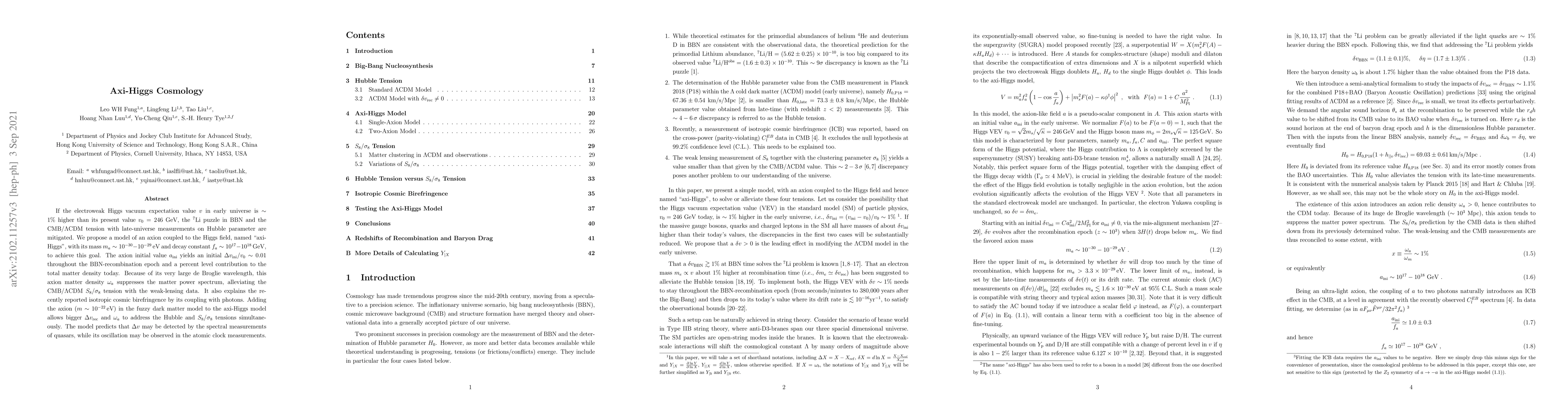If the electroweak Higgs vacuum expectation value $v$ in early universe is $\sim 1 \%$ higher than its present value $v_0=246$ GeV, the $^7$Li puzzle in BBN and the CMB/$\Lambda$CDM tension with late-universe measurements on Hubble parameter are mitigated. We propose a model of an axion coupled to the Higgs field, named ``axi-Higgs'', with its mass $m_a \sim 10^{-30} - 10^{-29}\,{\rm eV}$ and decay constant $f_a \sim 10^{17} - 10^{18}\,{\rm GeV}$, to achieve this goal. The axion initial value $a_{\rm ini}$ yields an initial $\Delta v_{\rm ini}/v_0 \sim 0.01$ throughout the BBN-recombination epoch and a percent level contribution to the total matter density today. Because of its very large de Broglie wavelength, this axion matter density $\omega_a$ suppresses the matter power spectrum, alleviating the CMB/$\Lambda$CDM $S_8/\sigma_8$ tension with the weak-lensing data. It also explains the recently reported isotropic cosmic birefringence by its coupling with photons. Adding the axion ($m \sim 10^{-22}\,$eV) in the fuzzy dark matter model to the axi-Higgs model allows bigger $\Delta v_{\rm rec}$ and $\omega_a$ to address the Hubble and $S_8/\sigma_8$ tensions simultaneously. The model predicts that $\Delta v$ may be detected by the spectral measurements of quasars, while its oscillation may be observed in the atomic clock measurements.