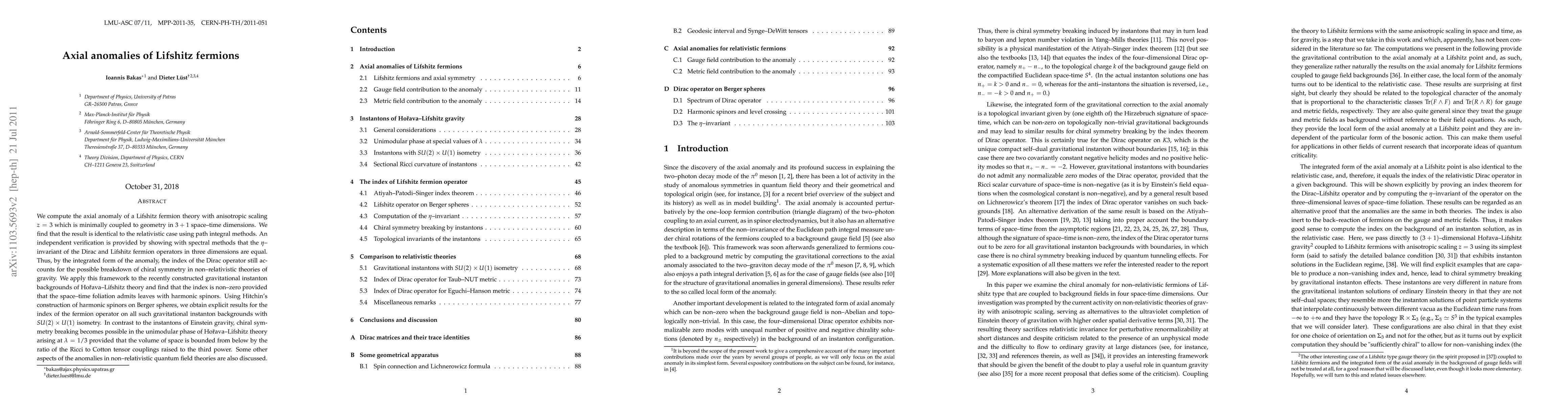 This paper computes the axial anomaly for Lifshitz fermions in 3+1 dimensions, showing it matches the relativistic case, and verifies this through spectral methods. It applies this framework to Horava-Lifshitz theory instantons, finding non-zero indices for chiral symmetry breakdown in the unimodular phase, contrasting with Einstein gravity instantons.