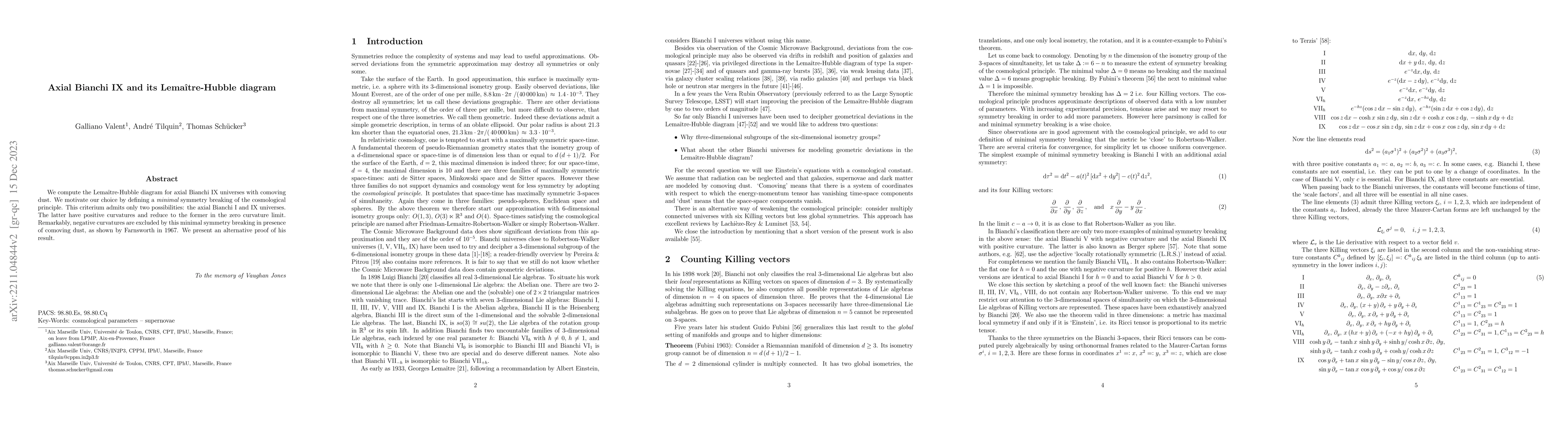 We compute the Lema{\^i}tre-Hubble diagram for axial Bianchi IX universes with comoving dust. We motivate our choice by defining a {\it minimal} symmetry breaking of the cosmological principle. This criterium admits only two possibilities: the axial Bianchi I and IX universes. The latter have positive curvatures and reduce to the former in the zero curvature limit. Remarkably, negative curvatures are excluded by this minimal symmetry breaking in presence of comoving dust.