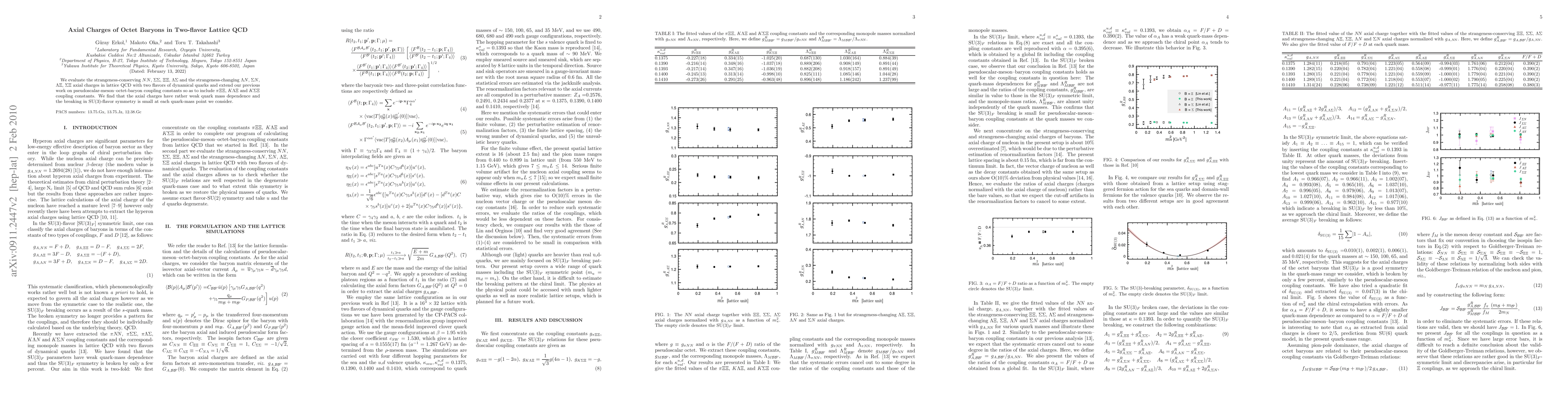 This study evaluates axial charges for various octet baryon pairs in two-flavor lattice QCD, revealing weak quark-mass dependence and minimal SU(3)-flavor symmetry breaking. It also extends previous work on pseudoscalar-meson-octet-baryon coupling constants to include new $\pi\Xi\Xi$, $K\Lambda\Xi$, and $K\Sigma\Xi$ couplings.