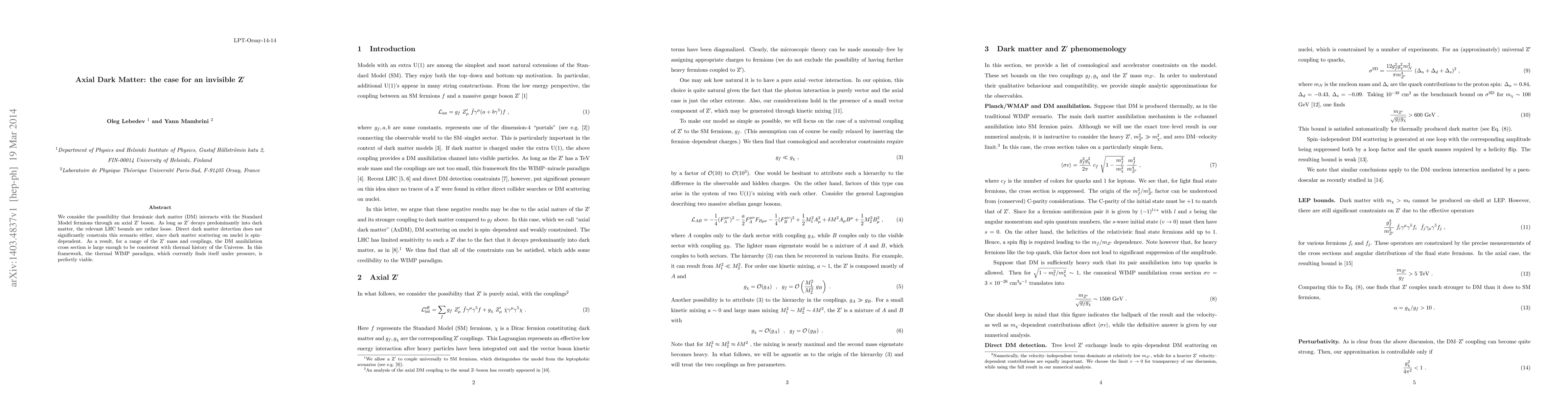 We consider the possibility that fermionic dark matter (DM) interacts with the Standard Model fermions through an axial Z' boson. As long as Z' decays predominantly into dark matter, the relevant LHC bounds are rather loose. Direct dark matter detection does not significantly constrain this scenario either, since dark matter scattering on nuclei is spin--dependent. As a result, for a range of the Z' mass and couplings, the DM annihilation cross section is large enough to be consistent with thermal history of the Universe. In this framework, the thermal WIMP paradigm, which currently finds itself under pressure, is perfectly viable.