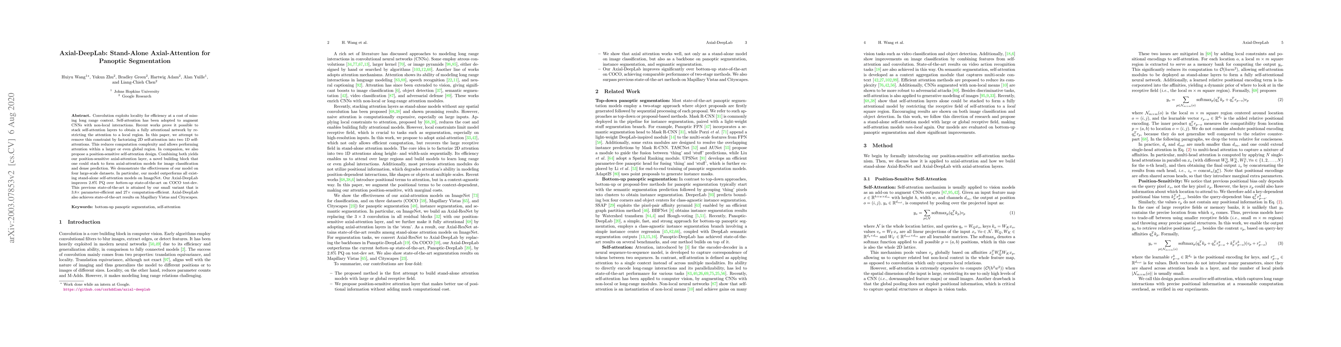 Axial-DeepLab introduces a novel axial-attention layer that reduces computational complexity by factorizing 2D self-attention into two 1D self-attentions, enabling efficient global context processing. The model achieves state-of-the-art performance on panoptic segmentation tasks across multiple large-scale datasets, including ImageNet, COCO, Mapillary Vistas, and Cityscapes.
