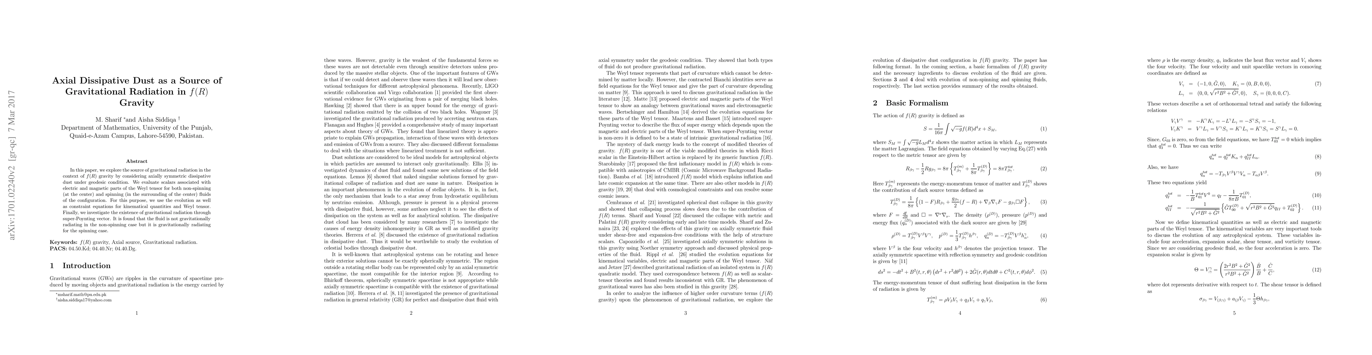 In this paper, we explore the source of gravitational radiation in the context of $f(R)$ gravity by considering axially symmetric dissipative dust under geodesic condition. We evaluate scalars associated with electric and magnetic parts of the Weyl tensor for both non-spinning (at the center) and spinning (in the surrounding of the center) fluids of the configuration. For this purpose, we use the evolution as well as constraint equations for kinematical quantities and Weyl tensor. Finally, we investigate the existence of gravitational radiation through super-Poynting vector. It is found that the fluid is not gravitationally radiating in the non-spinning case but it is gravitationally radiating for the spinning case.