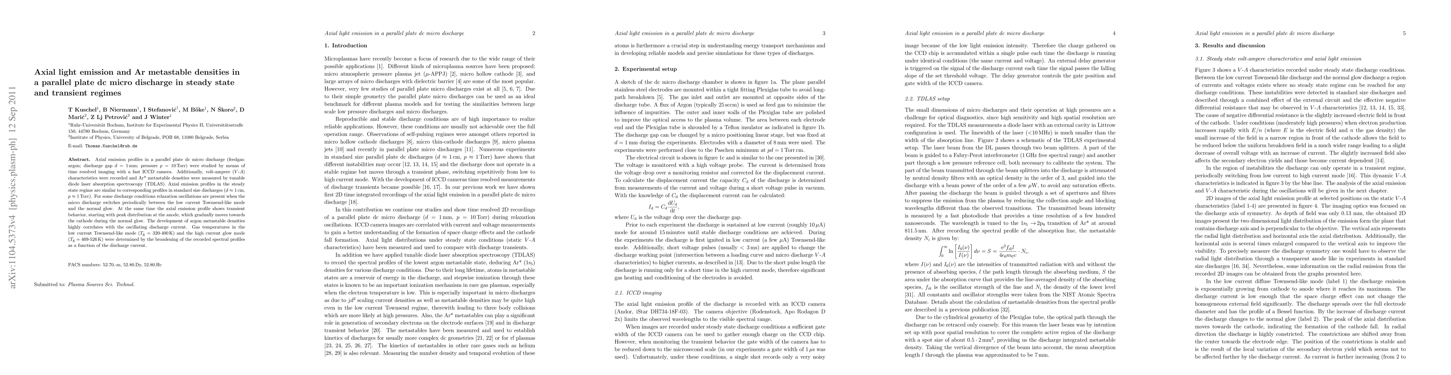 This study investigates axial emission profiles and Ar metastable densities in a parallel plate dc micro discharge using time-resolved imaging and TDLAS. The research reveals transient behavior in emission profiles and oscillating discharge current, correlating argon metastable densities with these oscillations.