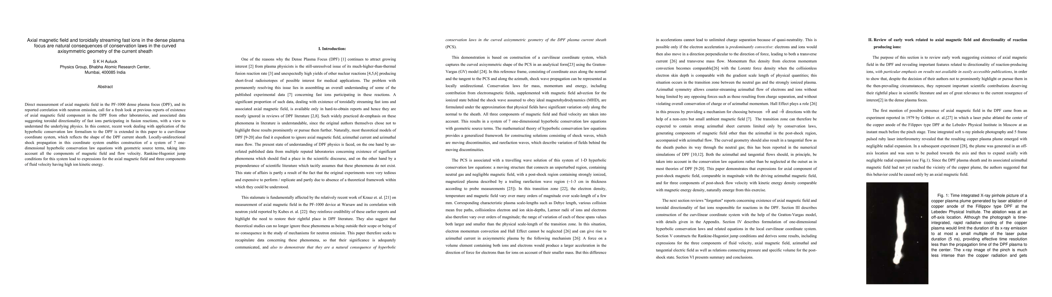 This paper explores the axial magnetic field and toroidally streaming fast ions in dense plasma focus devices, attributing these phenomena to conservation laws in the curved axisymmetric geometry of the current sheath. It extends hyperbolic conservation law formalism to curvilinear coordinates and derives expressions for axial magnetic field and high-energy fluid velocity components.