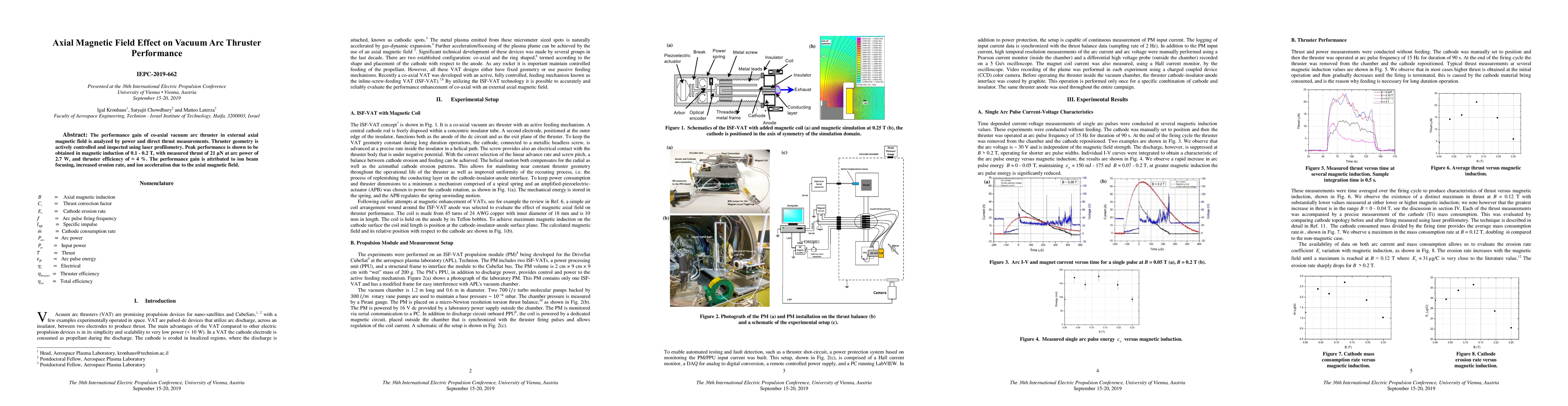 The paper presents detailed experimental analysis of axial magnetic field effects on vacuum arc thruster performance, including thrust, power, and efficiency measurements, as well as cathode erosion rate evaluation.