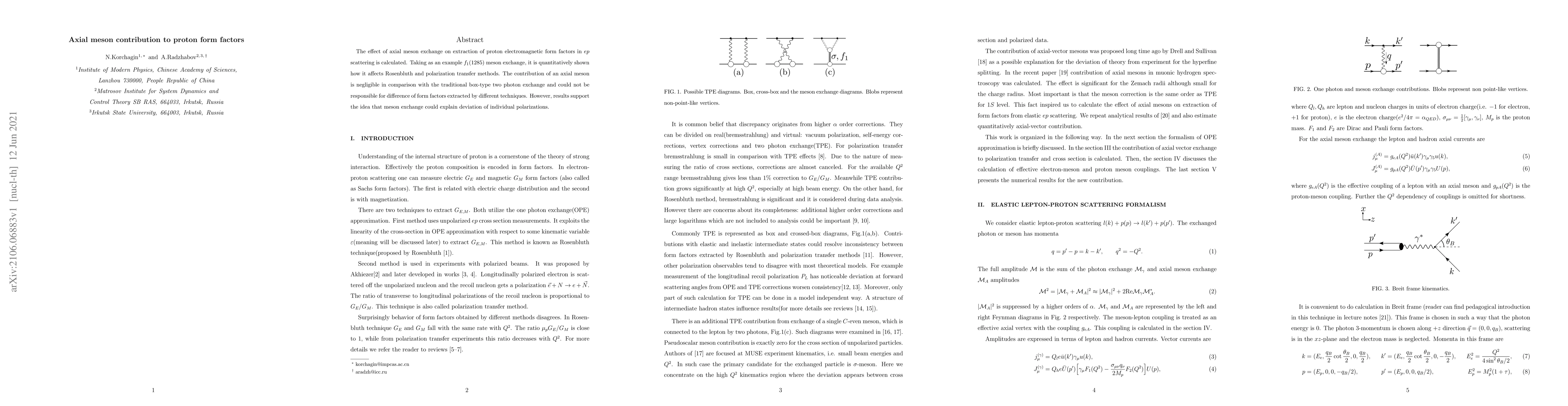 This study quantifies the impact of axial meson exchange, specifically the $f_1(1285)$ meson, on proton electromagnetic form factors in $ep$ scattering. It concludes that axial meson contributions are negligible compared to traditional two-photon exchange, but they may help explain deviations in individual polarizations.