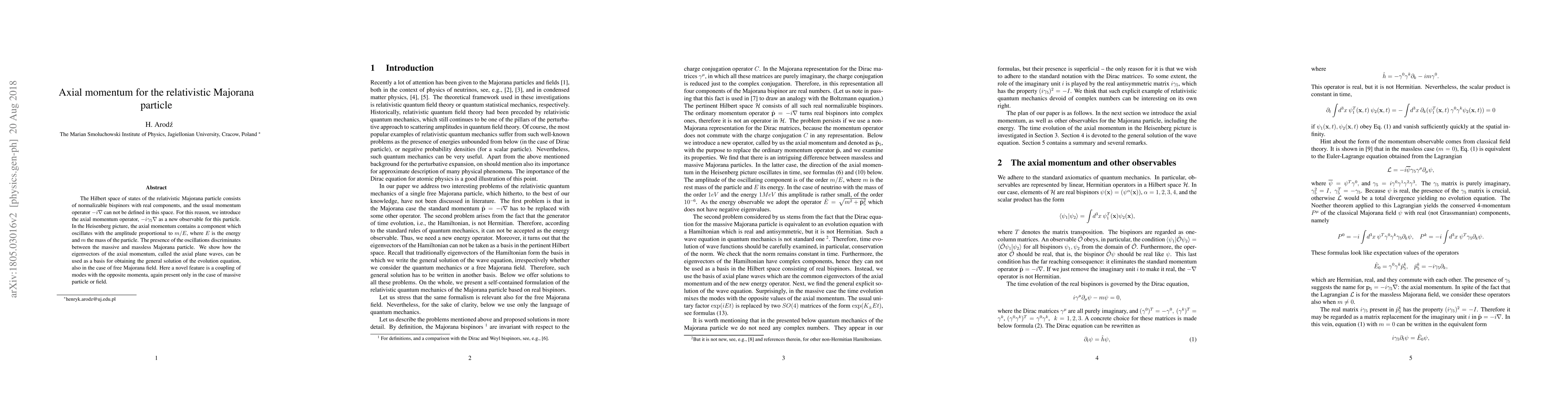 This paper introduces the axial momentum operator for the relativistic Majorana particle, which lacks a conventional momentum operator due to its real-component bispinors. The axial momentum reveals oscillations that distinguish massive from massless Majorana particles, and it serves as a basis for solving the evolution equation, highlighting unique mode coupling in massive cases.