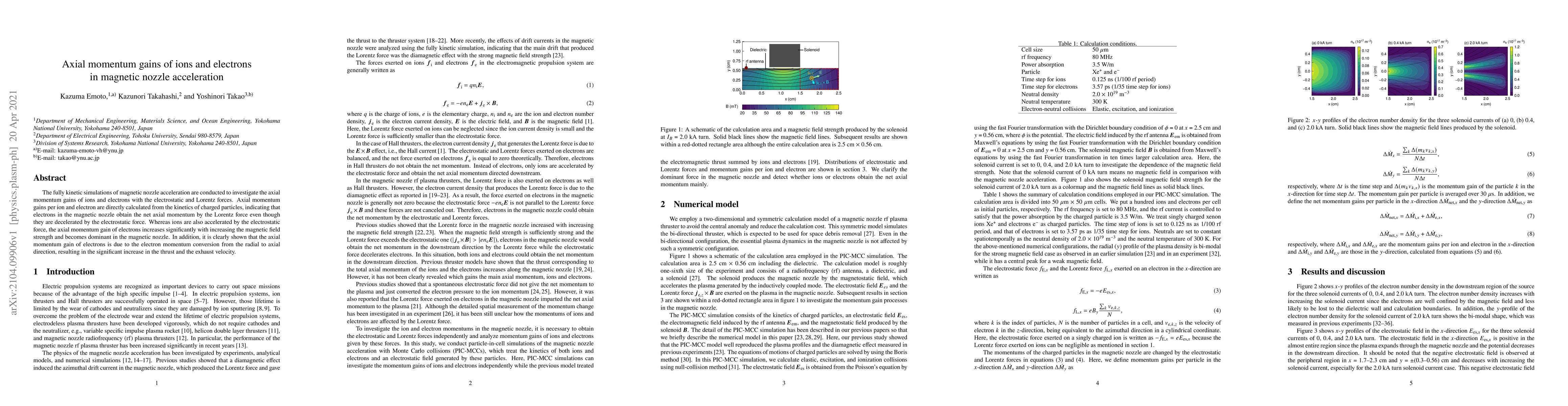 This paper investigates axial momentum gains in magnetic nozzle acceleration through kinetic simulations, revealing that electrons gain net axial momentum via the Lorentz force despite electrostatic deceleration. Ions are also accelerated by electrostatic forces, but electron momentum gains increase significantly with stronger magnetic fields, leading to enhanced thrust and exhaust velocity.