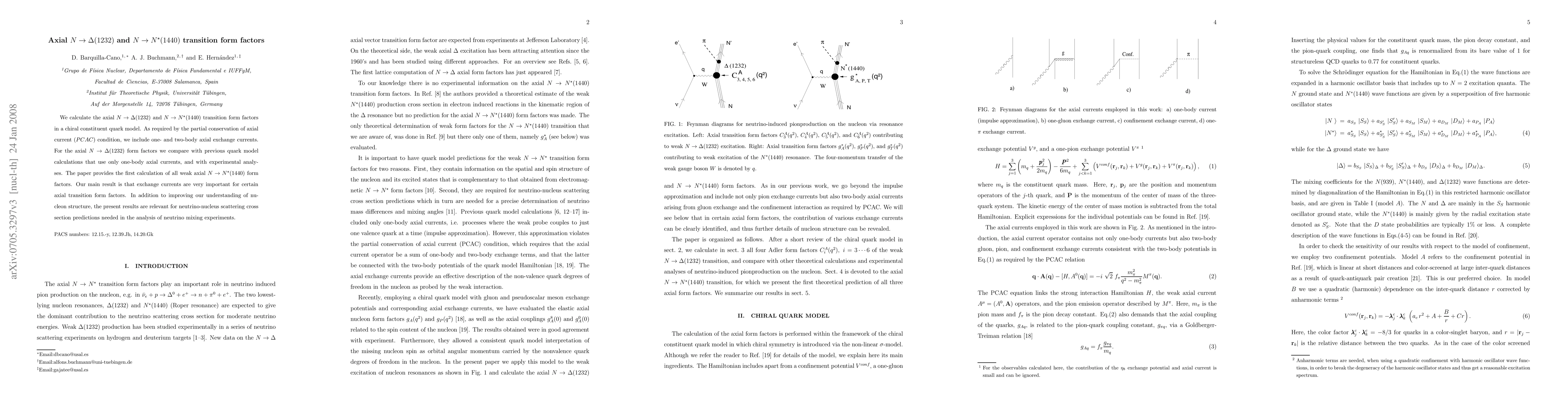 This paper calculates axial $N\to \Delta(1232)$ and $N\to N^{\star}(1440)$ transition form factors in a chiral constituent quark model, emphasizing the importance of one- and two-body axial exchange currents. The study reveals that exchange currents significantly affect certain axial transition form factors, enhancing our understanding of nucleon structure and improving neutrino-nucleus scattering predictions.