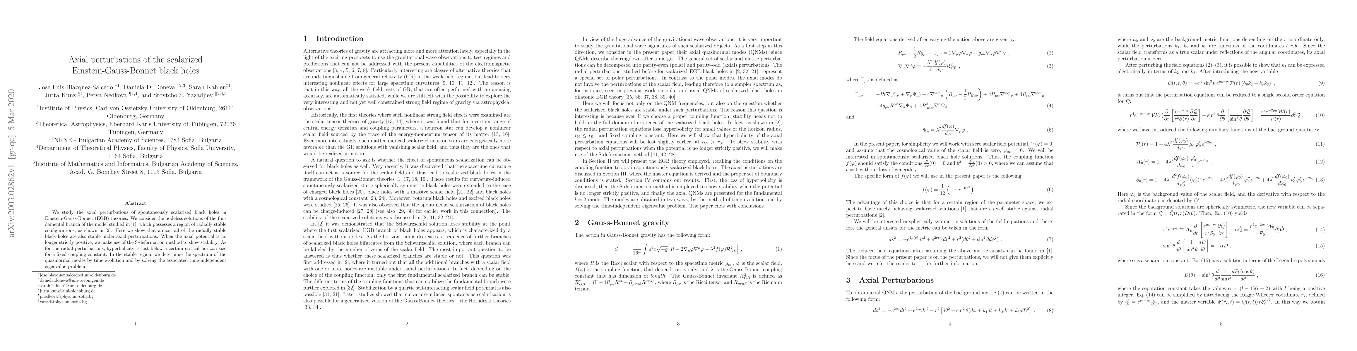 We study the axial perturbations of spontaneously scalarized black holes in Einstein-Gauss-Bonnet (EGB) theories. We consider the nodeless solutions of the fundamental branch of the model studied in [1], which possesses a region of radially stable configurations, as shown in [2]. Here we show that almost all of the radially stable black holes are also stable under axial perturbations. When the axial potential is no longer strictly positive, we make use of the S-deformation method to show stability. As for the radial perturbations, hyperbolicity is lost below a certain critical horizon size for a fixed coupling constant. In the stable region, we determine the spectrum of the quasinormal modes by time evolution and by solving the associated time-independent eigenvalue problem.