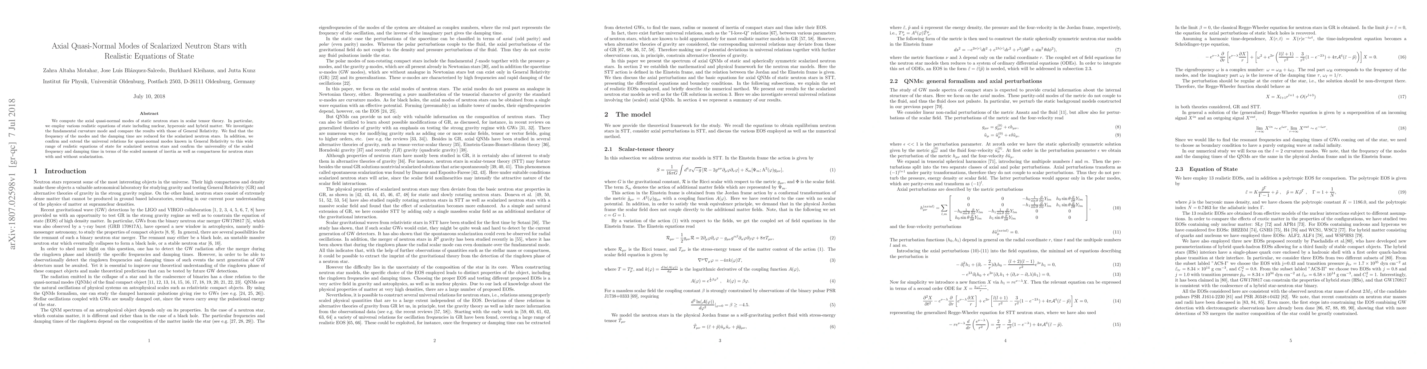 The paper presents a comprehensive numerical analysis of axial quasi-normal modes for scalarized neutron stars using various realistic equations of state in scalar-tensor theory, confirming and extending universal relations for these modes.