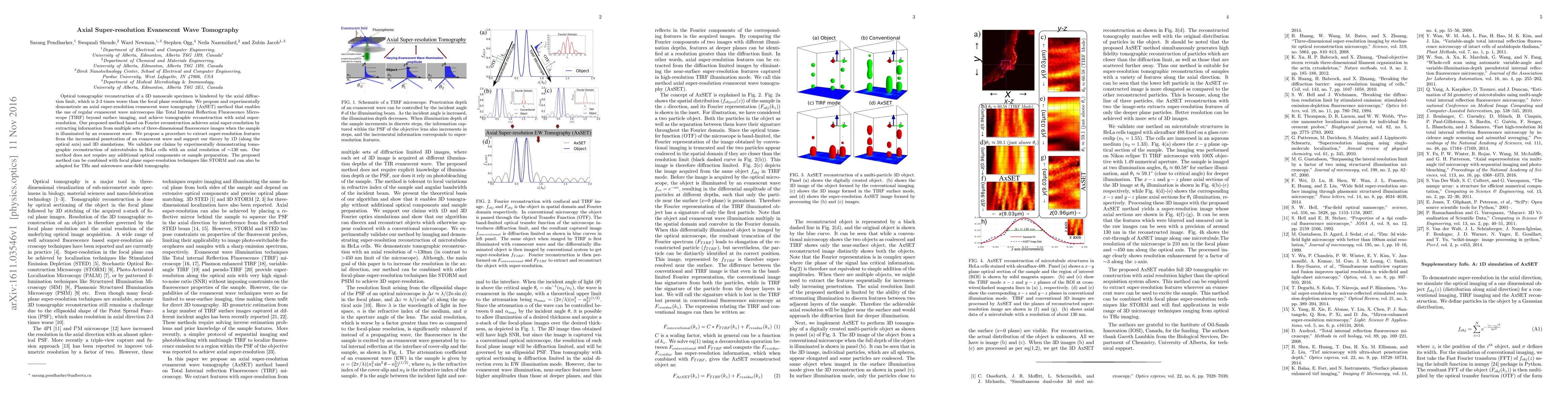 Optical tomographic reconstruction of a 3D nanoscale specimen is hindered by the axial diffraction limit, which is 2-3 times worse than the focal plane resolution. We propose and experimentally demonstrate an axial super-resolution evanescent wave tomography (AxSET) method that enables the use of regular evanescent wave microscopes like Total Internal Reflection Fluorescence Microscope (TIRF) beyond surface imaging, and achieve tomographic reconstruction with axial super-resolution. Our proposed method based on Fourier reconstruction achieves axial super-resolution by extracting information from multiple sets of three-dimensional fluorescence images when the sample is illuminated by an evanescent wave. We propose a procedure to extract super-resolution features from the incremental penetration of an evanescent wave and support our theory by 1D (along the optical axis) and 3D simulations. We validate our claims by experimentally demonstrating tomographic reconstruction of microtubules in HeLa cells with an axial resolution of $\sim$130 nm. Our method does not require any additional optical components or sample preparation. The proposed method can be combined with focal plane super-resolution techniques like STORM and can also be adapted for THz and microwave near-field tomography.