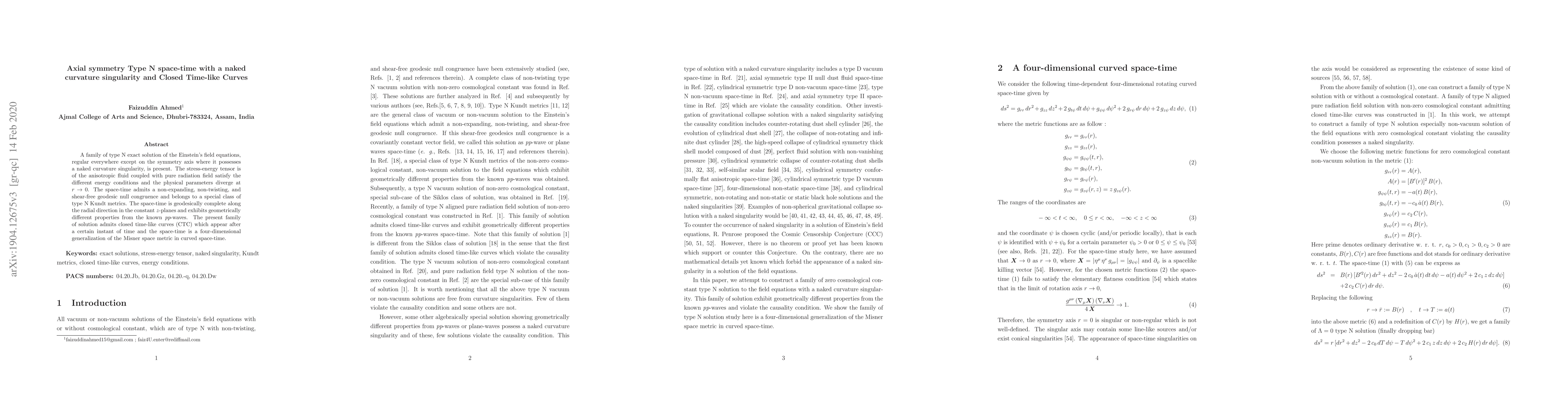 A family of type N exact solution of the Einstein's field equations, regular everywhere except on the symmetry axis where it possesses a naked curvature singularity, is present. The stress-energy tensor is of the anisotropic fluid coupled with pure radiation field satisfy the different energy conditions and the physical parameters diverge $r \rightarrow 0$. The space-time admitting a non-expanding, non-twisting, and shear-free geodesic null congruence and belongs to a special class of type N Kundt metrics. The space-time is geodesically complete along the radiation direction in the constant $z$-planes and exhibits geometrically different properties from the known pp-waves. The present family of solution admits closed time-like curves (CTC) which appear after a certain instant of time and the space-time is a four-dimensional generalization of the Misner space metric in curved space-time.