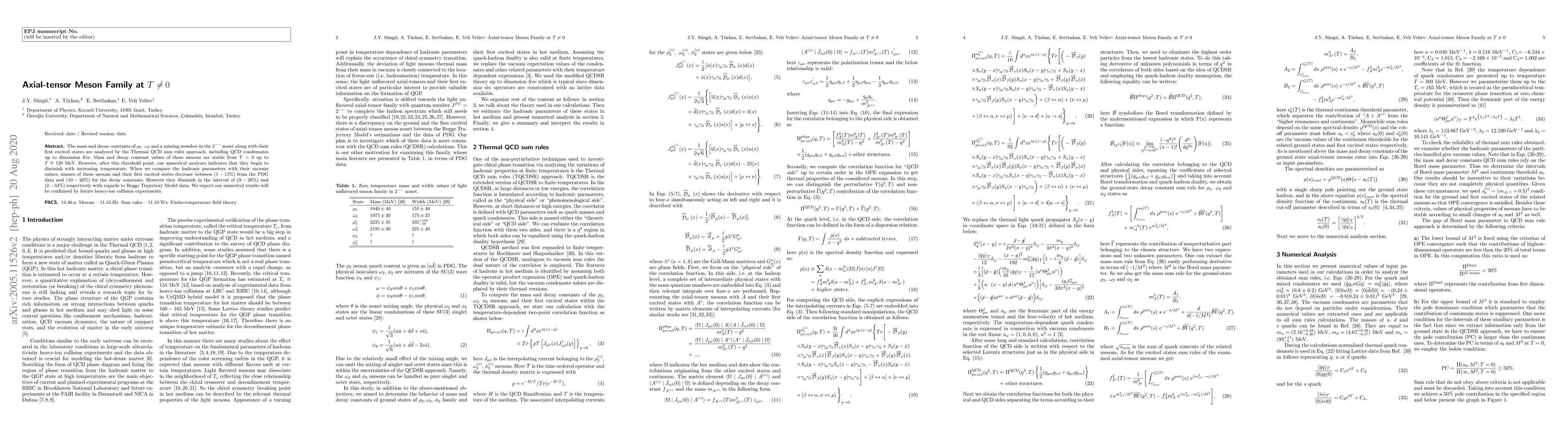 The mass and decay constant of the axial-tensor meson nonets $\rho_2,~\omega_2$ and a missing member and also their first excited states are analyzed by the Thermal QCD sum rules model including QCD condensates up to dimension five. Mass and decay constant values in terms of variations of temperature are very well stable from $T=0$ up to ~$T \cong 120 ~\mathrm{MeV}$. However nearly after these threshold, our numerical analysis indicate that they begin to diminish with increasing temperature. Mass value of these mesons and their first excited states decrease about $(1-13\%)$ compared to vacuum values and $(10-26\%)$ for the decay constants according to PDG data and $(9-26\%)$ and $(2-34\%)$ respectively concerning Regge Trajectory Model in the corresponding Thermal QCD sum rules calculations. The experimental results are already copious, but expected to grow up at ongoing and future heavy-ion experimental programs allowing us to compare our results.