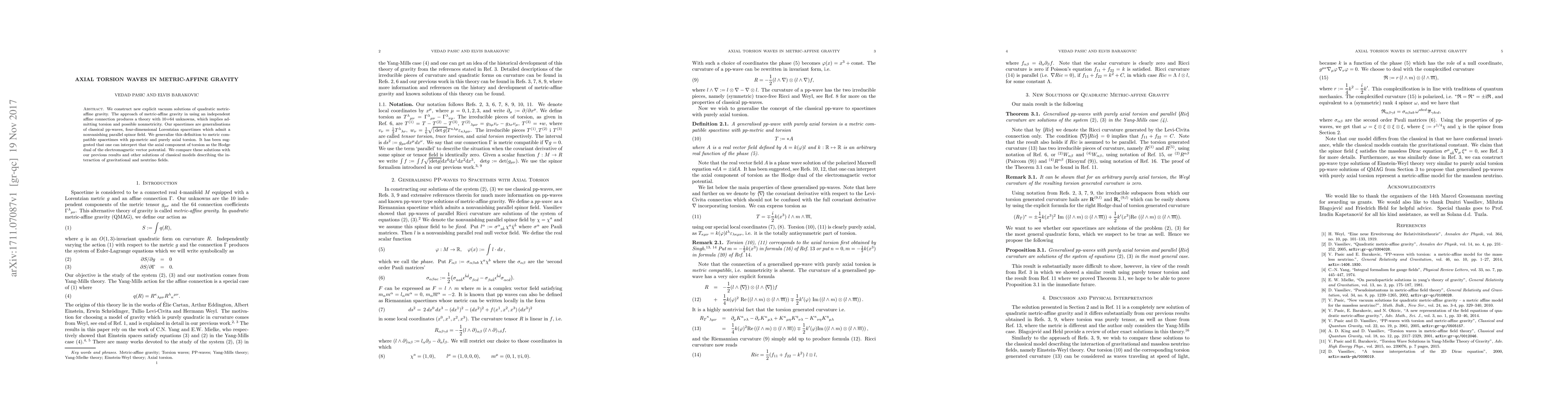 The paper presents novel generalized pp-wave solutions with purely axial torsion in metric-affine gravity, providing a new perspective on quadratic metric-affine gravity.