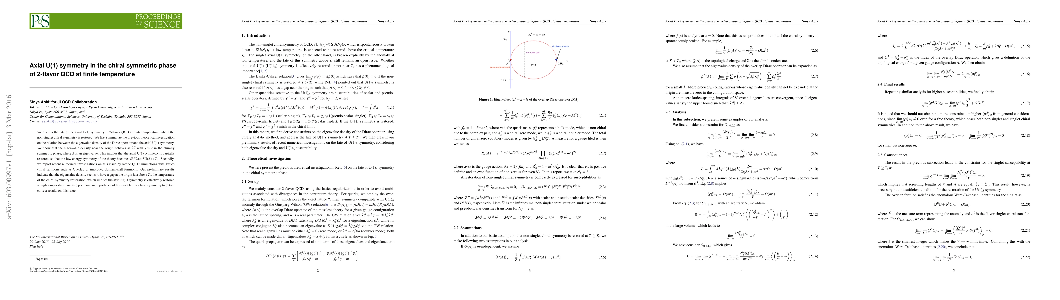 We discuss the fate of the axial U(1) symmetry in 2-flavor QCD at finite temperature, where the non-singlet chiral symmetry is restored. We first summarize the previous theoretical investigation on the relation between the eigenvalue density of the Dirac operator and the axial U(1) symmetry. We show that the eigenvalue density near the origin behaves as $\lambda^\gamma$ with $\gamma > 2$ in the chirally symmetric phase, where $\lambda$ is an eigenvalue. This implies that the axial U(1) symmetry is partially restored, so that the low energy symmetry of the theory becomes SU(2)$\otimes$ SU(2)$\otimes$ Z$_4$. Secondly, we report recent numerical investigations on this issue by lattice QCD simulations with lattice chiral fermions such as Overlap or improved domain-wall fermions. Our preliminary results indicate that the eigenvalue density seems to have a gap at the origin just above $T_c$, the temperature of the chiral symmetry restoration, which implies the axial U(1) symmetry is effectively restored at high temperature. We also point out an importance of the exact lattice chiral symmetry to obtain correct results on this issue.