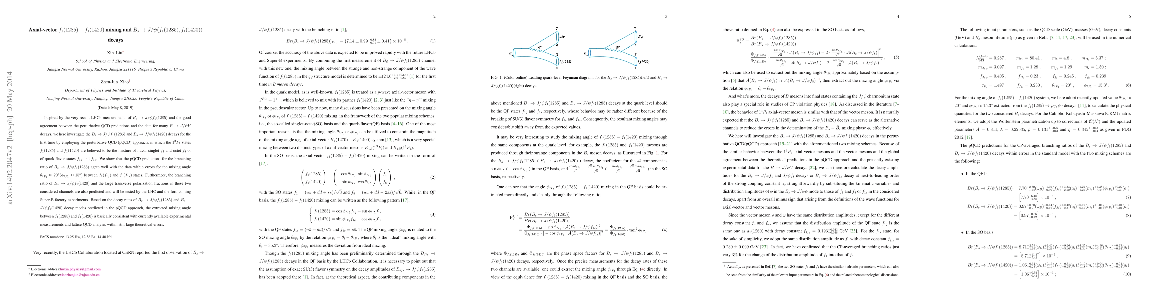Researchers used perturbative QCD to predict branching ratios for $B_s o J/ heta f_1(1285)$ and $B_s o J/ heta f_1(1420)$ decays, finding a mixing angle of around $20^\circ$ between the two states.