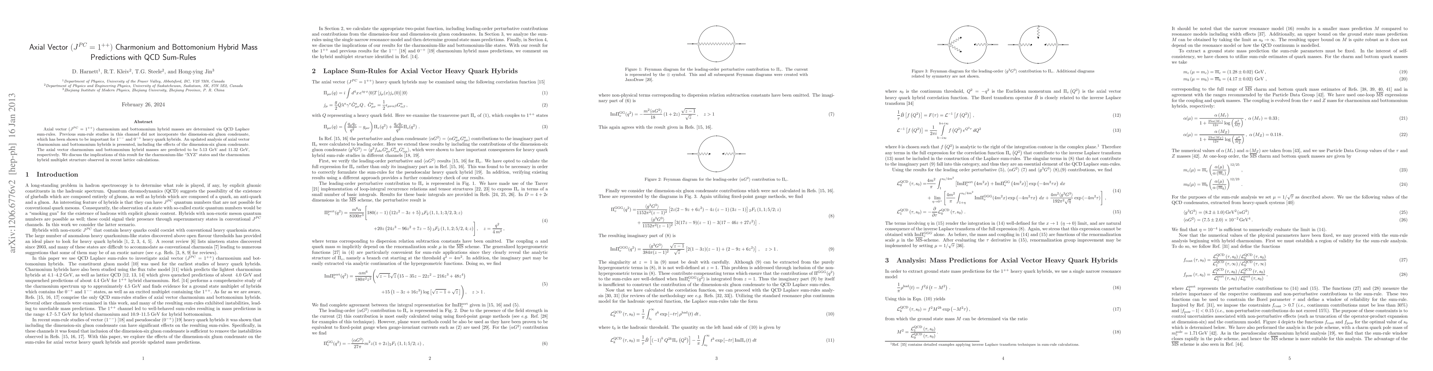 This paper predicts the masses of axial vector $(J^{PC}=1^{++})$ charmonium and bottomonium hybrids using QCD sum-rules, incorporating the dimension-six gluon condensate for the first time in this analysis. The predicted masses are 5.13 GeV for charmonium and 11.32 GeV for bottomonium, with implications for the XYZ states and hybrid multiplet structures.