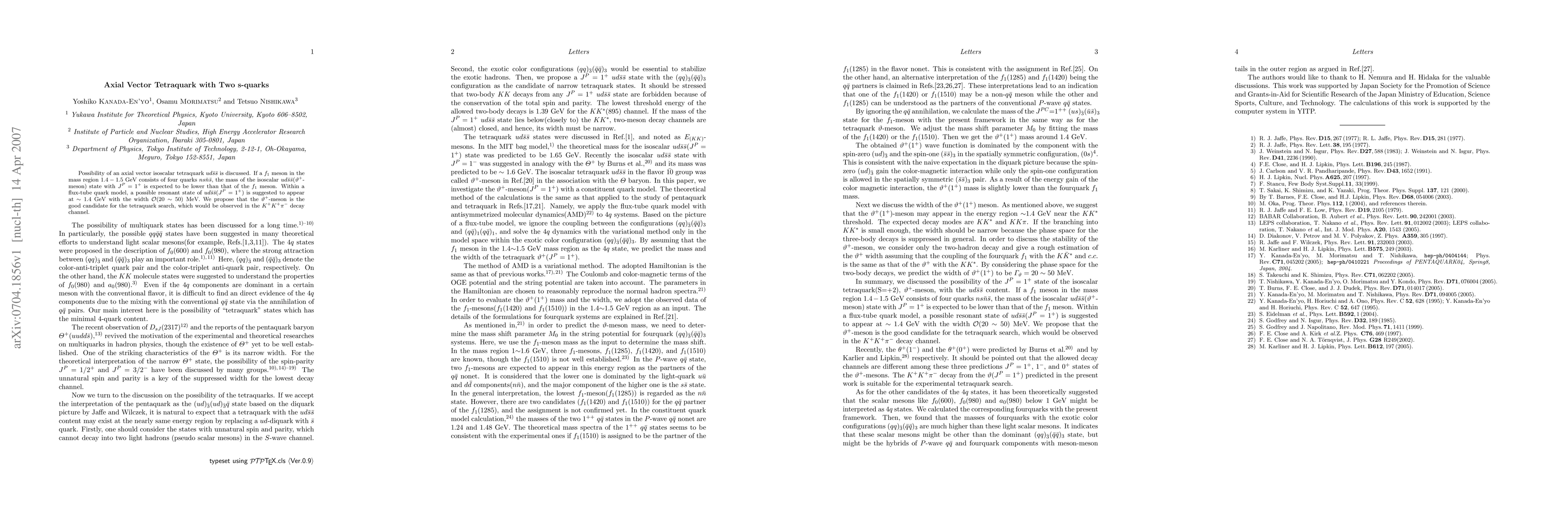 Possibility of an axial vector isoscalar tetraquark $ud\bar{s}\bar{s}$ is discussed. If a $f_1$ meson in the mass region $1.4-1.5$ GeV consists of four quarks $ns\bar{n}\bar{s}$, the mass of the isoscalar $ud\bar{s}\bar{s}$($\vartheta^+$-meson) state with $J^P=1^+$ is expected to be lower than that of the $f_1$ meson. Within a flux-tube quark model, a possible resonant state of $ud\bar{s}\bar{s}(J^{P}=1^{+})$ is suggested to appear at $\sim$ 1.4 GeV with the width ${\cal{O}}(20\sim 50)$ MeV. We propose that the $\vartheta^+$-meson is the good candidate for the tetraquark search, which would be observed in the $K^+K^+\pi^-$ decay channel.