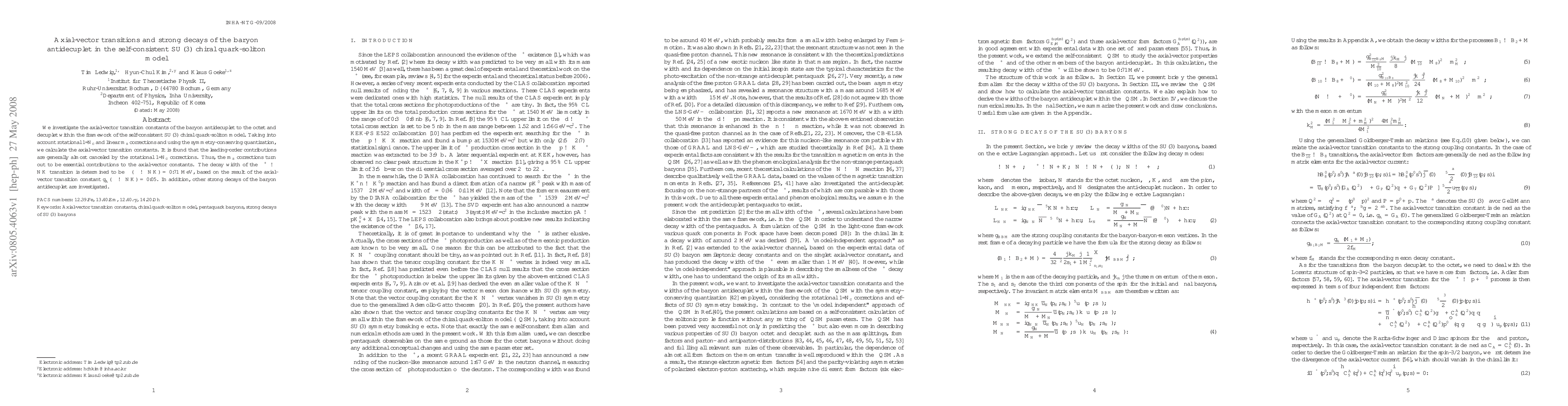 This paper calculates the axial-vector transition constants for the baryon antidecuplet using the self-consistent SU(3) chiral quark-soliton model, finding that m_s corrections are crucial. The decay width for Theta^+ to NK transition is determined to be Γ(Θ+ → NK) = 0.71 MeV.