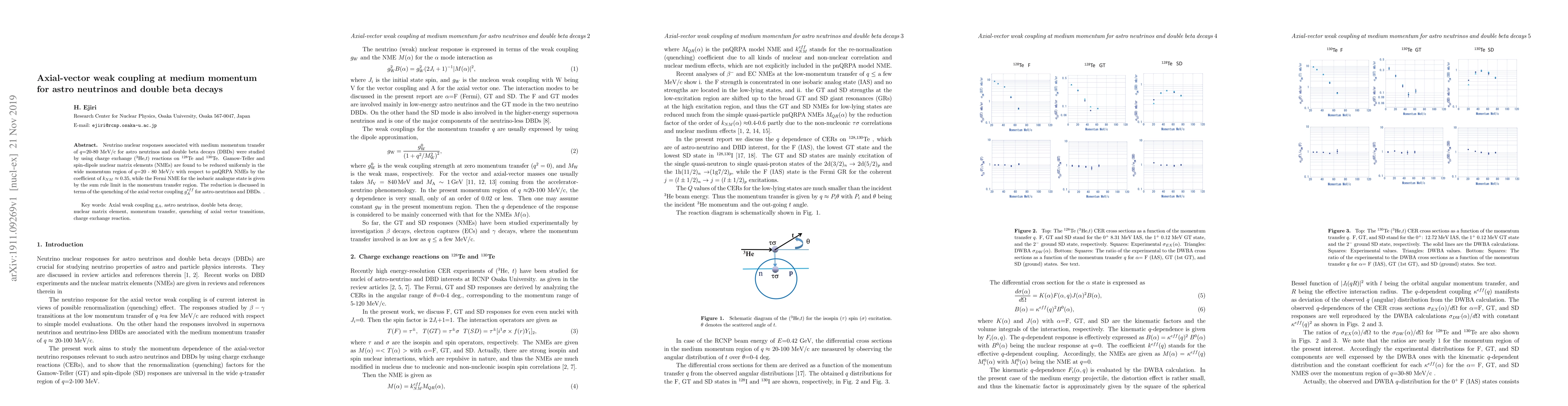 Summary: This study investigates neutrino nuclear responses for medium momentum transfers in astro neutrinos and double beta decays, finding reduced Gamow-Teller and spin dipole matrix elements by a factor of approximately 0.35, attributed to the quenching of axial-vector coupling (g_A).