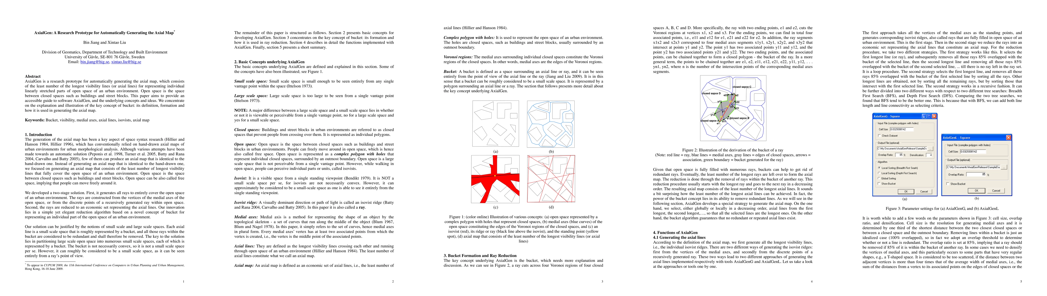 AxialGen is a prototype for automatically generating axial maps that represent the longest visibility lines in urban open spaces. The paper focuses on explaining the key concept of "bucket" and its role in the axial map generation process.