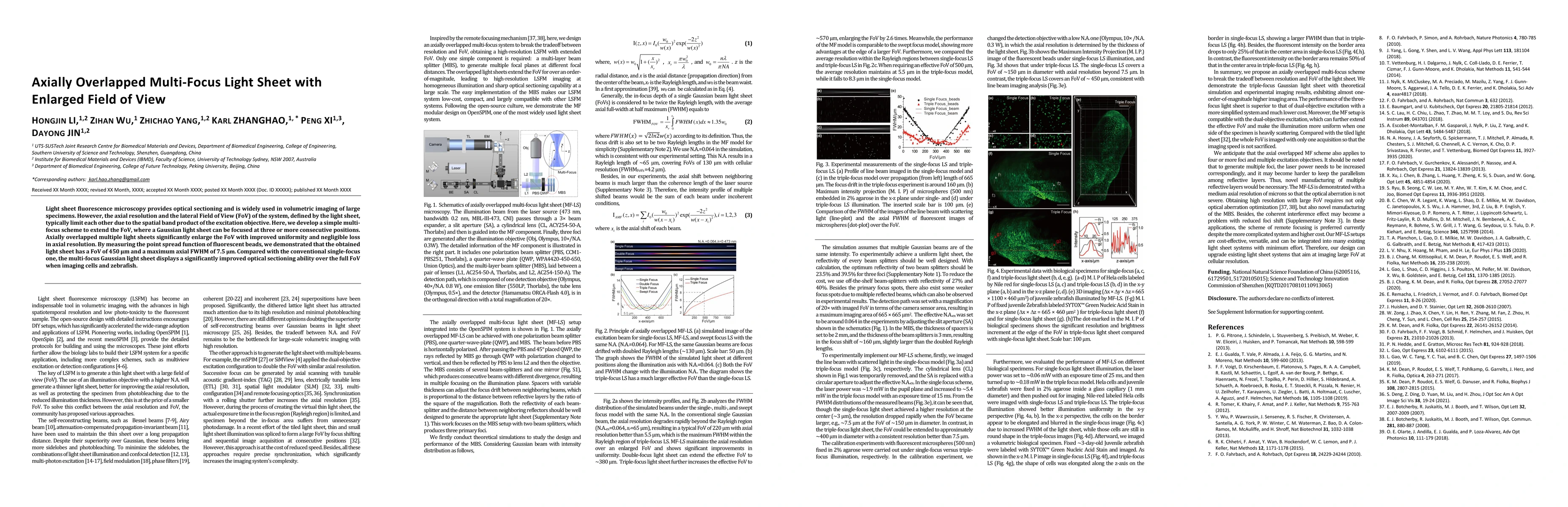 This research introduces a multi-focus light sheet scheme to expand the field of view in light sheet fluorescence microscopy without compromising axial resolution. By focusing a Gaussian light sheet at multiple consecutive positions, the method achieves a 450 µm FoV with 7.5 µm axial FWHM, demonstrating enhanced optical sectioning for imaging cells and zebrafish compared to traditional single-focus approaches.