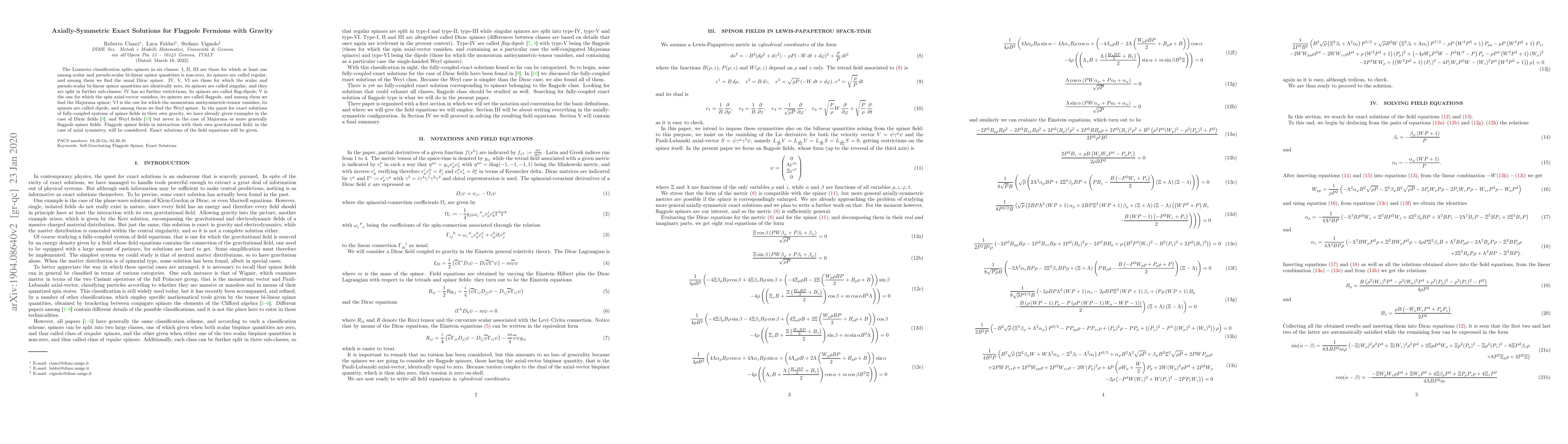 This paper explores axially-symmetric exact solutions for flagpole fermions, which are a subclass of singular spinors where the spin axial-vector vanishes, including Majorana spinors, interacting with their own gravitational field. It provides the first fully-coupled solutions for these flagpole spinor fields in such a scenario.
