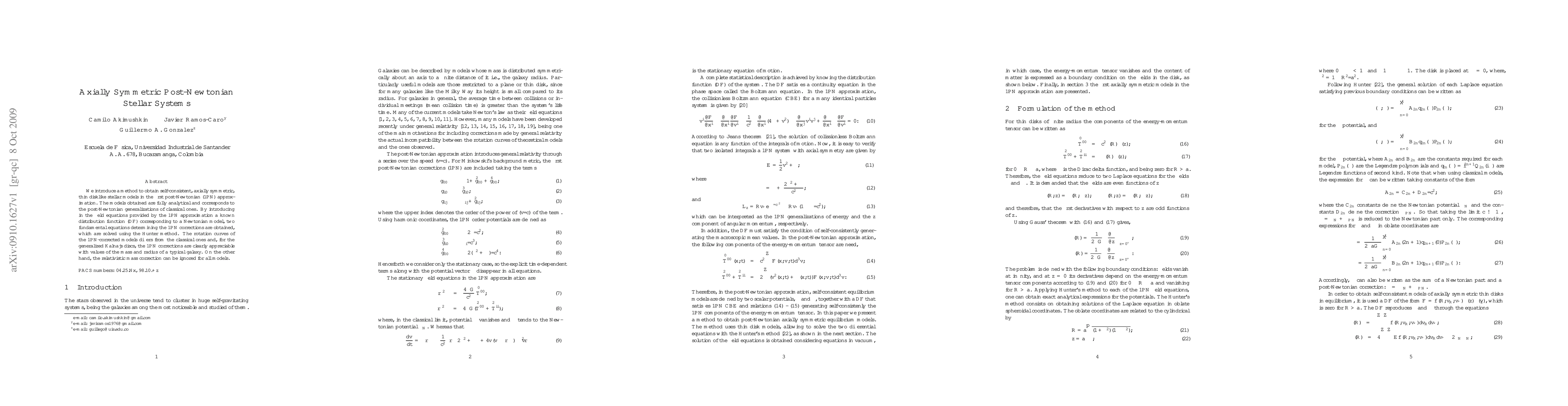 This paper introduces a method to create self-consistent, axially symmetric stellar models in the first post-Newtonian approximation, showing that relativistic mass corrections can be ignored for typical galaxies.