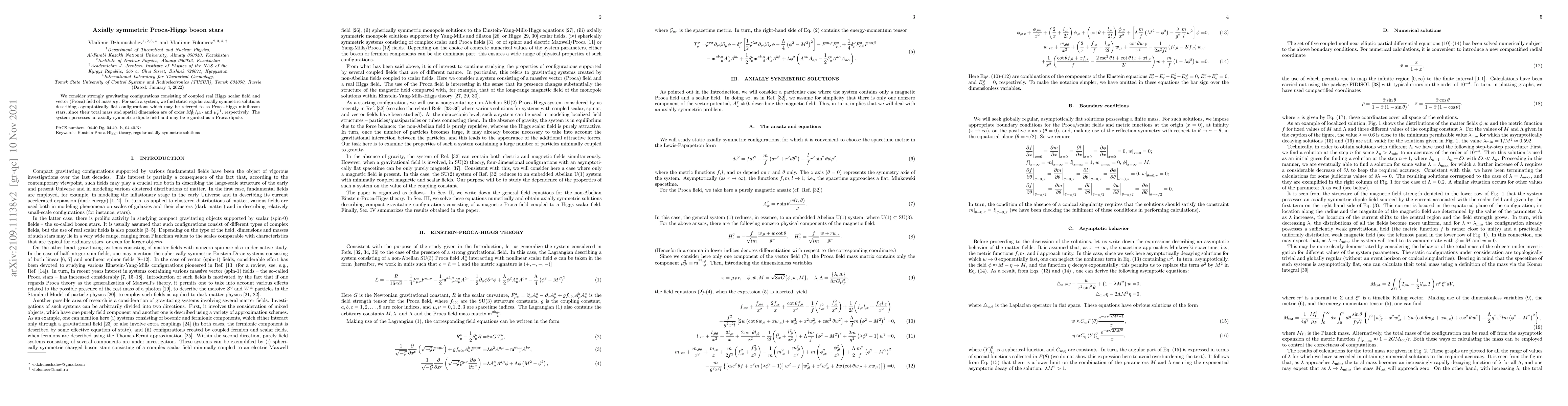 This paper explores static, axially symmetric solutions for coupled Higgs and Proca fields, describing Proca-Higgs miniboson stars with masses and dimensions proportional to the Planck mass and Proca field mass, respectively. These configurations exhibit an axially symmetric dipole field.