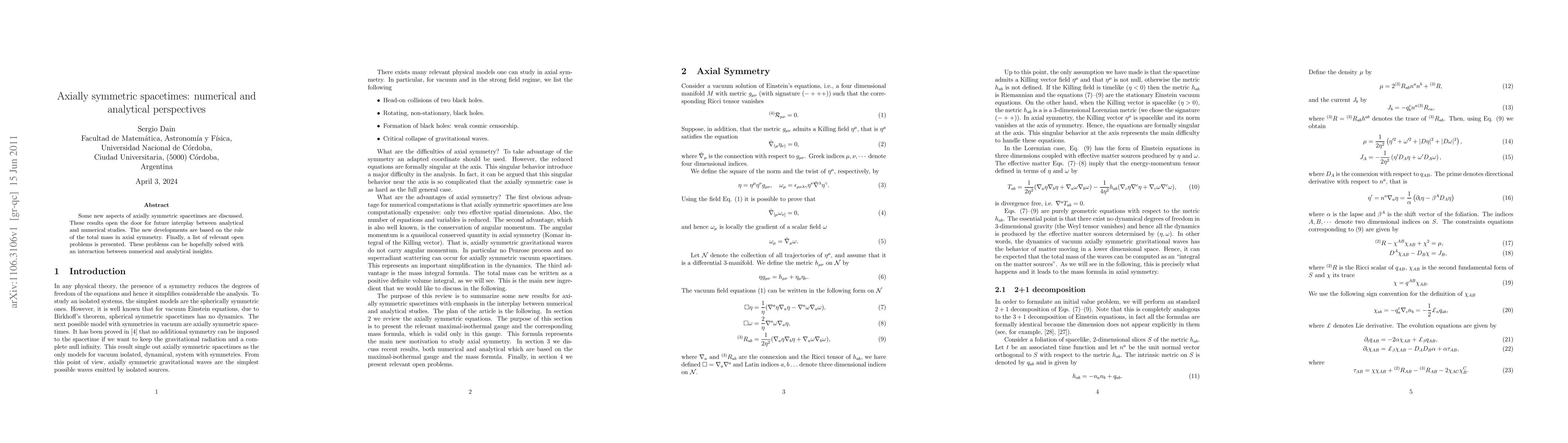 Some new aspects of axially symmetric spacetimes are discussed. These results open the door for future interplay between analytical and numerical studies. The new developments are based on the role of the total mass in axial symmetry. Finally, a list of relevant open problems is presented. These problems can be hopefully solved with an interaction between numerical and analytical insights.