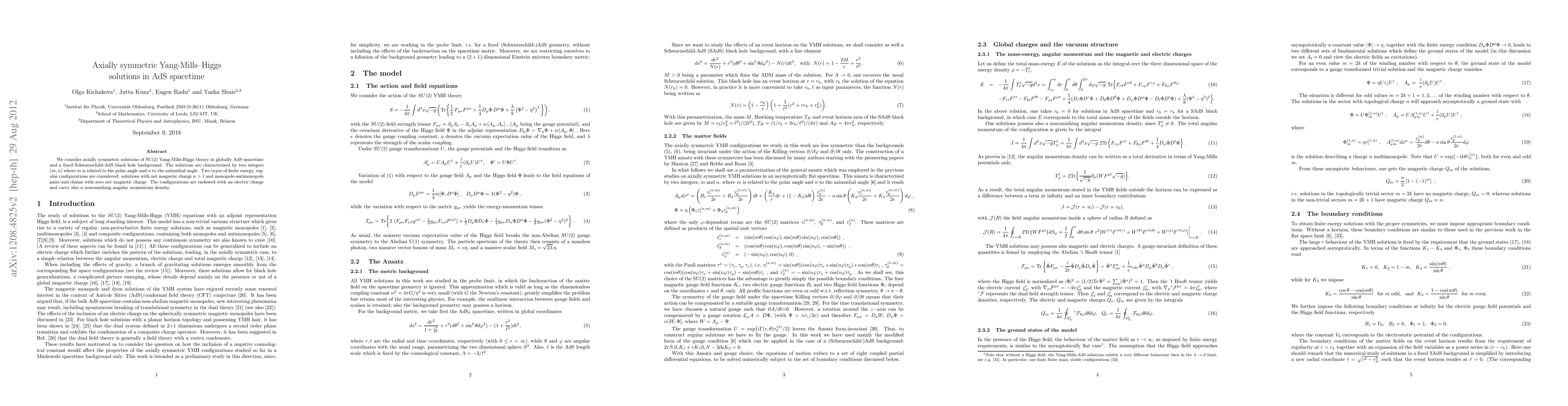 We consider axially symmetric solutions of SU(2) Yang-Mills-Higgs theory in globally AdS spacetime and a fixed Schwarzschild-AdS black hole background. The solutions are characterized by two integers $(m,n)$ where $m$ is related to the polar angle and $n$ to the azimuthal angle. Two types of finite energy, regular configurations are considered: solutions with net magnetic charge $n>1$ and monopole-antimonopole pairs and chains with zero net magnetic charge. The configurations are endowed with an electric charge and carry also a nonvanishing angular momentum density.