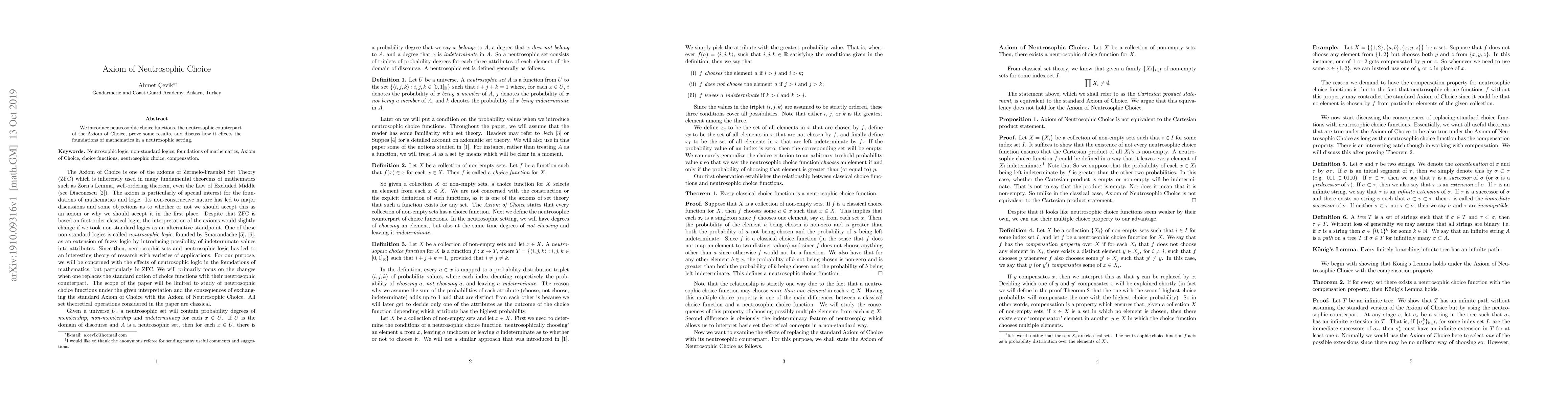 This paper introduces neutrosophic choice functions, analogous to the Axiom of Choice, and explores their implications for the foundations of mathematics within a neutrosophic framework. It also proves several results related to these functions.