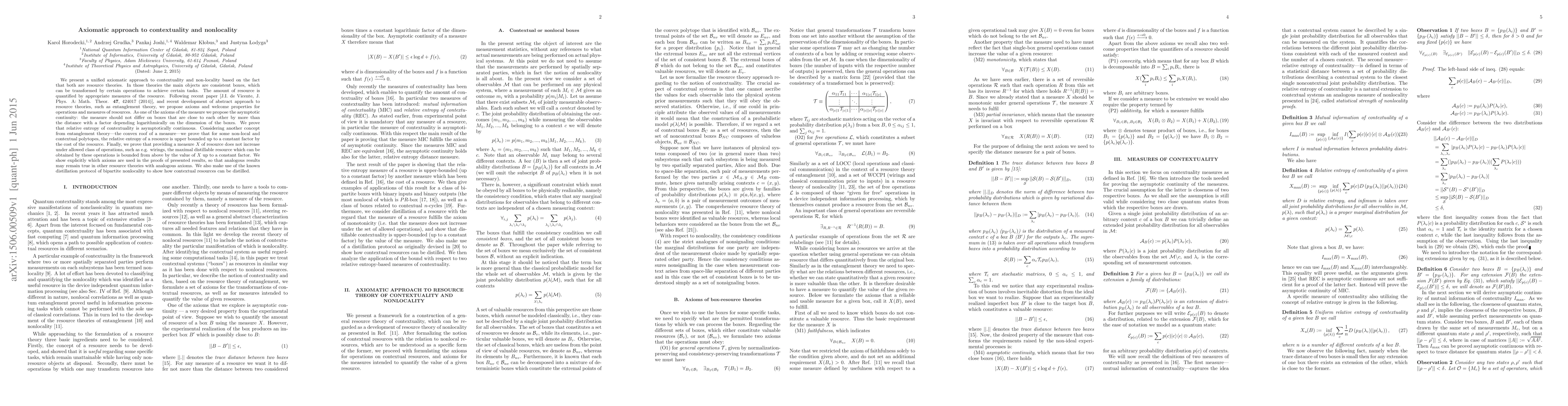 This research proposes a unified axiomatic approach to contextuality and non-locality, treating them as resource theories. It introduces axioms for operations and measures, proving properties like asymptotic continuity for the relative entropy of contextuality. The study also explores relationships between contextual and non-local resources, demonstrating upper bounds and distillation protocols, all while highlighting the applicability of these findings to other resource theories.