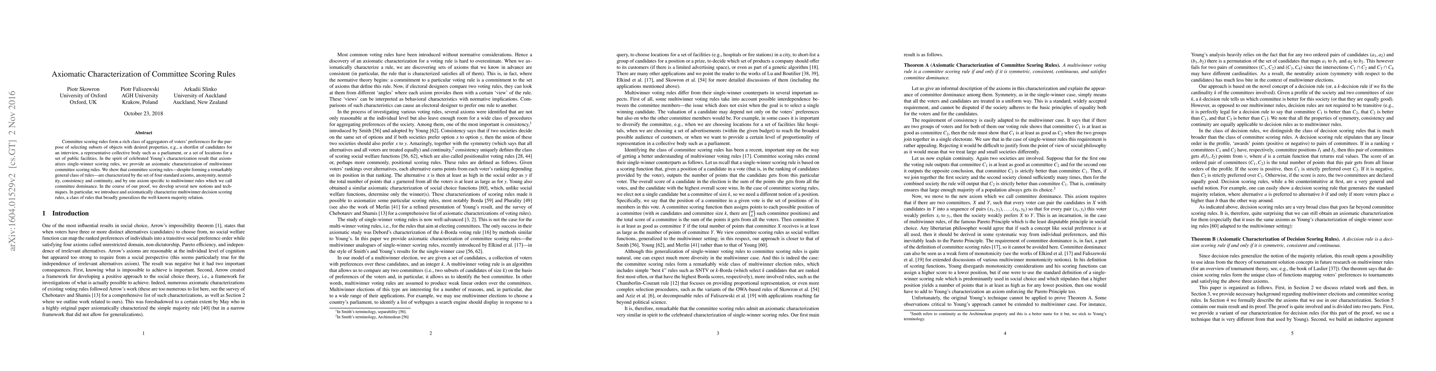 The paper provides an axiomatic characterization of multiwinner committee scoring rules, demonstrating they are defined by four standard axioms and one specific axiom, termed committee dominance. It also introduces and characterizes multiwinner decision scoring rules, extending the concept of majority relations.
