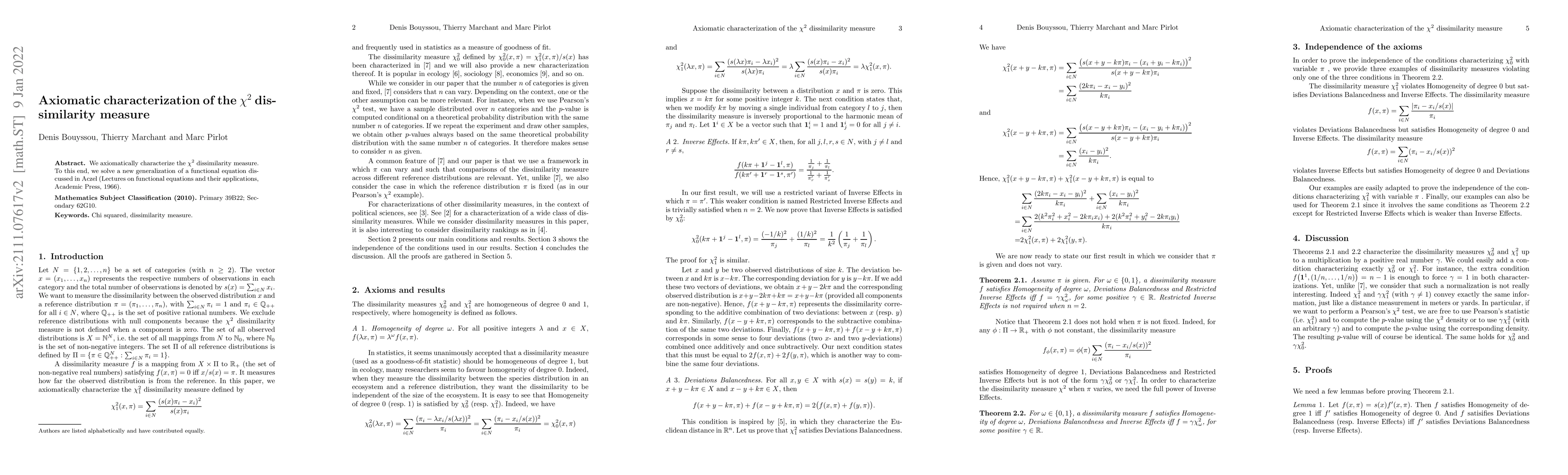 Summary: This paper axiomatically characterizes the $\chi^{2}$ dissimilarity measure by solving a generalized functional equation, extending previous work by Aczel on functional equations. The result provides a new understanding of the $\chi^{2}$ measure within a theoretical framework.