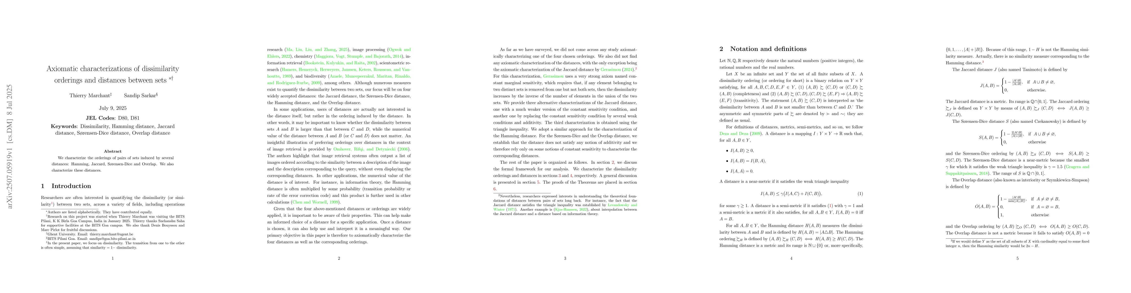 The paper uses axiomatic methods to characterize orderings of pairs of sets induced by Hamming, Jaccard, Sørensen-Dice, and Overlap distances.